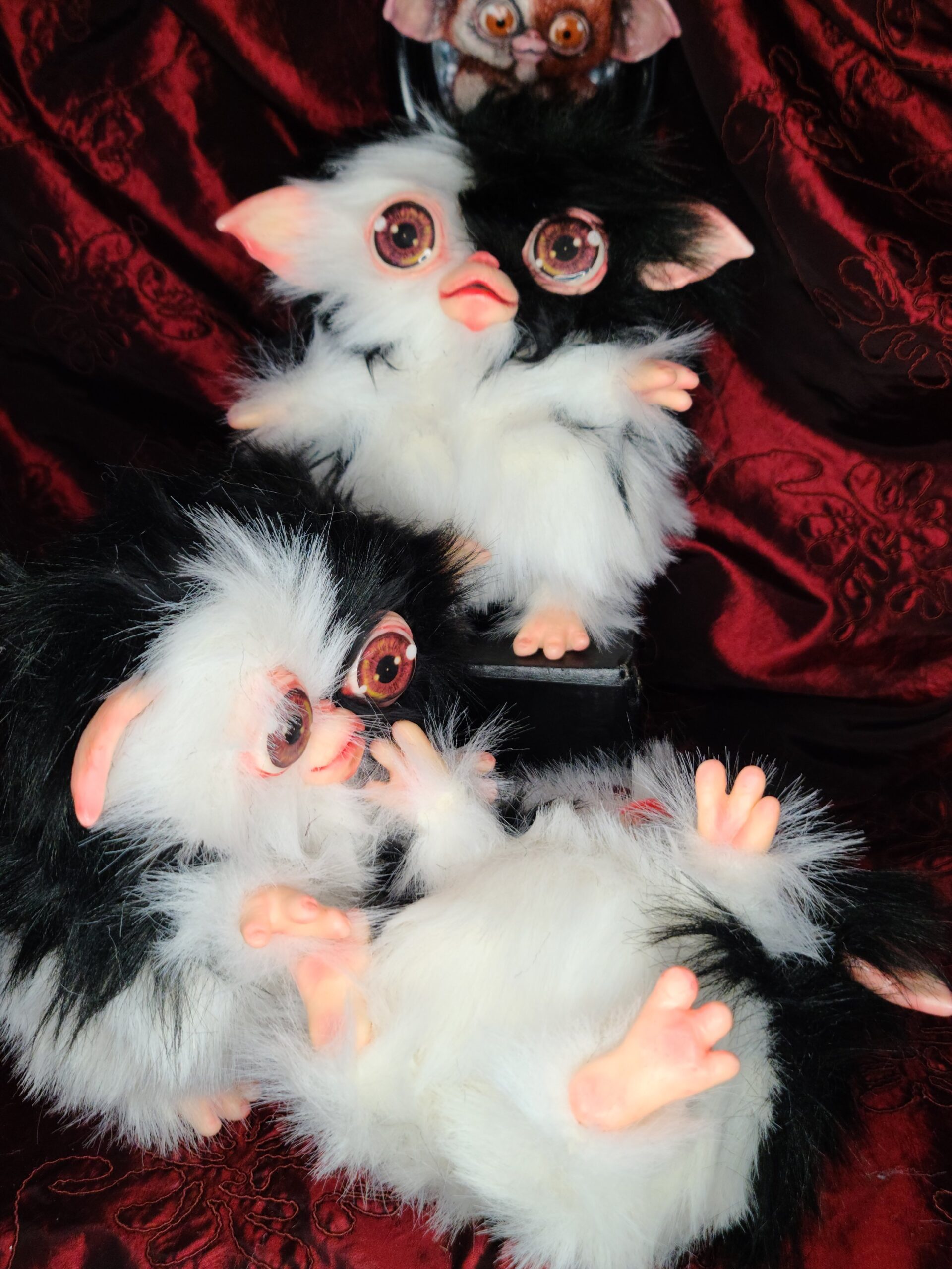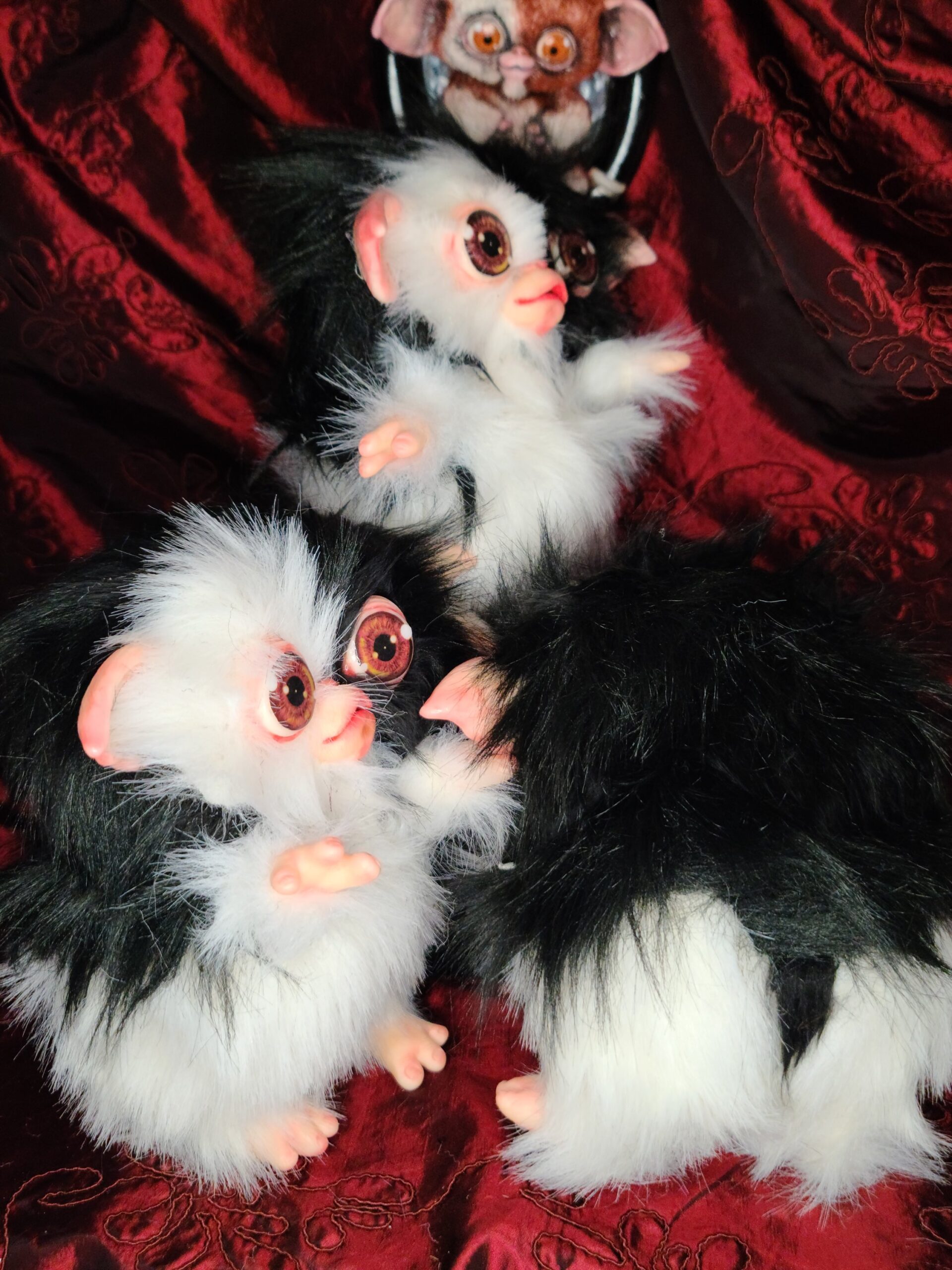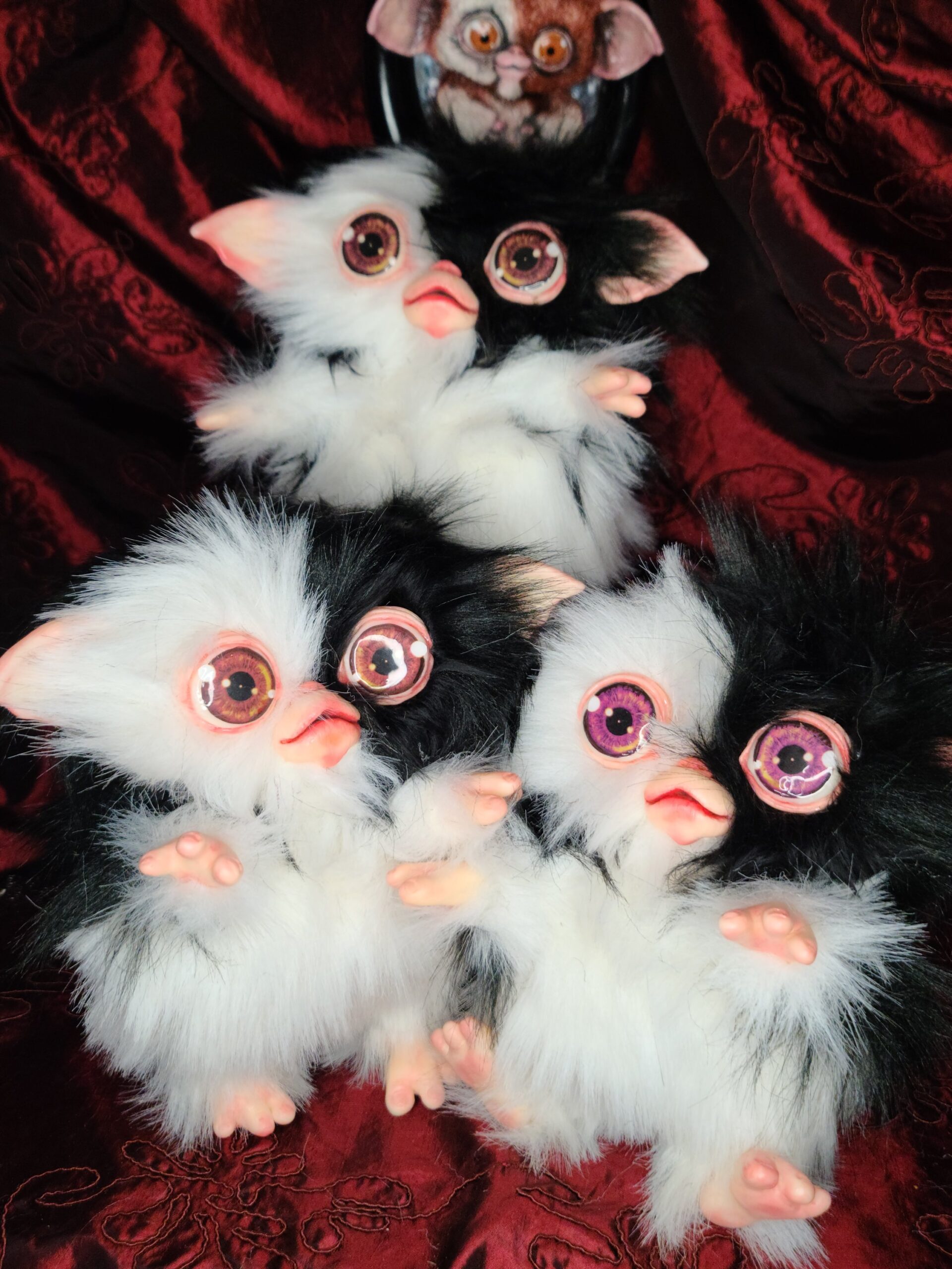 Questa è una personale interpretazione di Gizmo realizzata da Serena Pieruccini, che ha saputo combinare materiali morbidi e parti rigide per ottenere un effetto realistico e al tempo stesso fiabesco. Le orecchie, il naso e la bocca, gli occhi, le mani e i piedi sono modellati a mano in resina dura, così da garantire forme precise e grande espressività. Il corpo è invece realizzato con pelliccia sintetica bicolore, tessuti morbidi e imbottiture soffici, completamente cuciti e assemblati a mano.