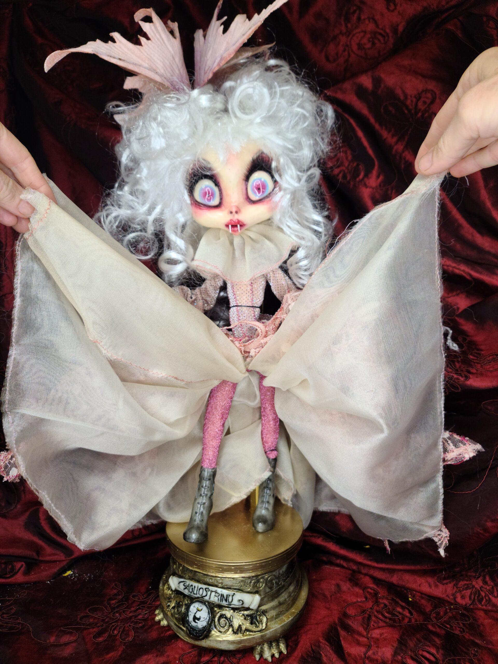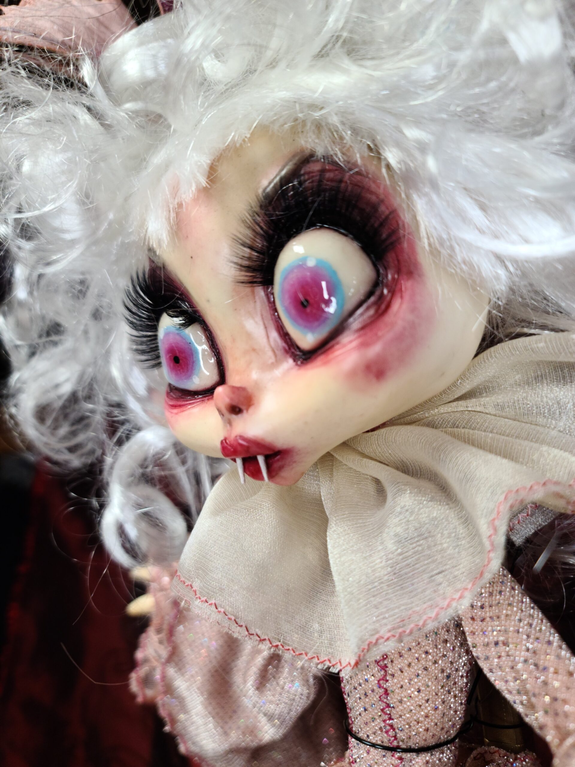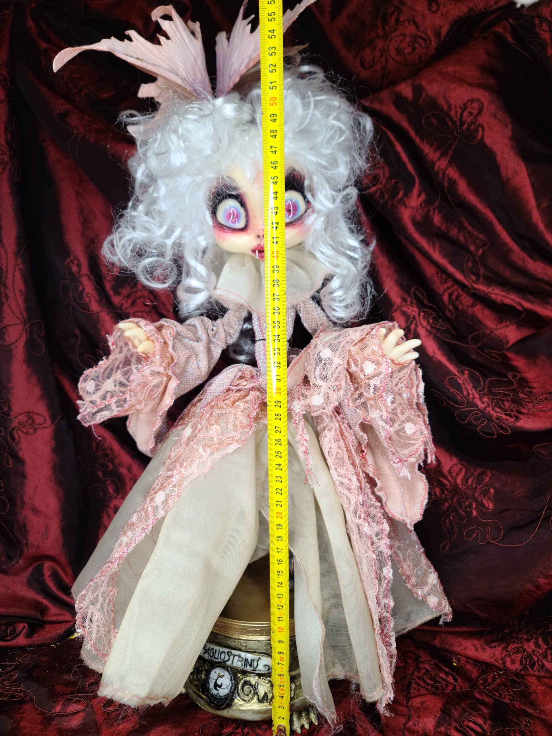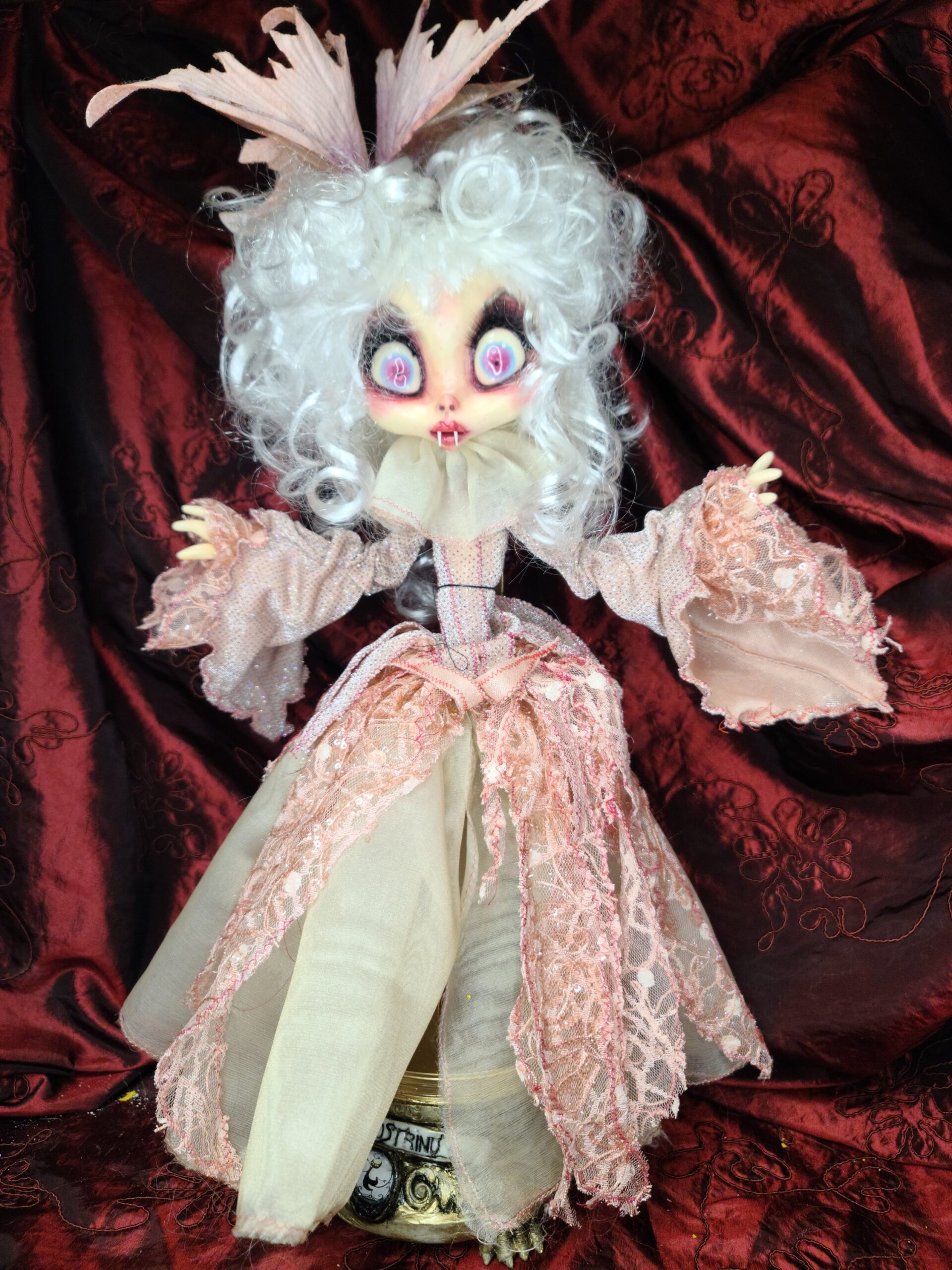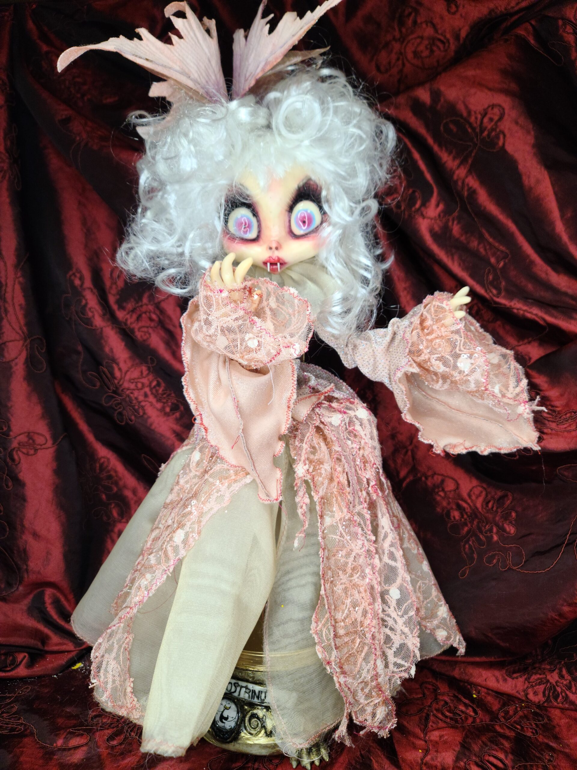 Un pezzo unico di artigianato che fonde eleganza e oscurità: FalenRose, una vampira eterea dagli occhi ipnotici e dall’abito ricco di tessuti morbidi, pizzi e trasparenze nei toni rosati. Il volto, caratterizzato da un design espressivo e studiato nei minimi dettagli per enfatizzare il suo fascino gotico-fiabesco, insieme alle mani in resina, alla parrucca bianca vaporosa e a ogni piega del vestito, è il risultato del lavoro meticoloso di Serena Pieruccini, che ha progettato, modellato, cucito e assemblato ogni elemento con precisione sartoriale.