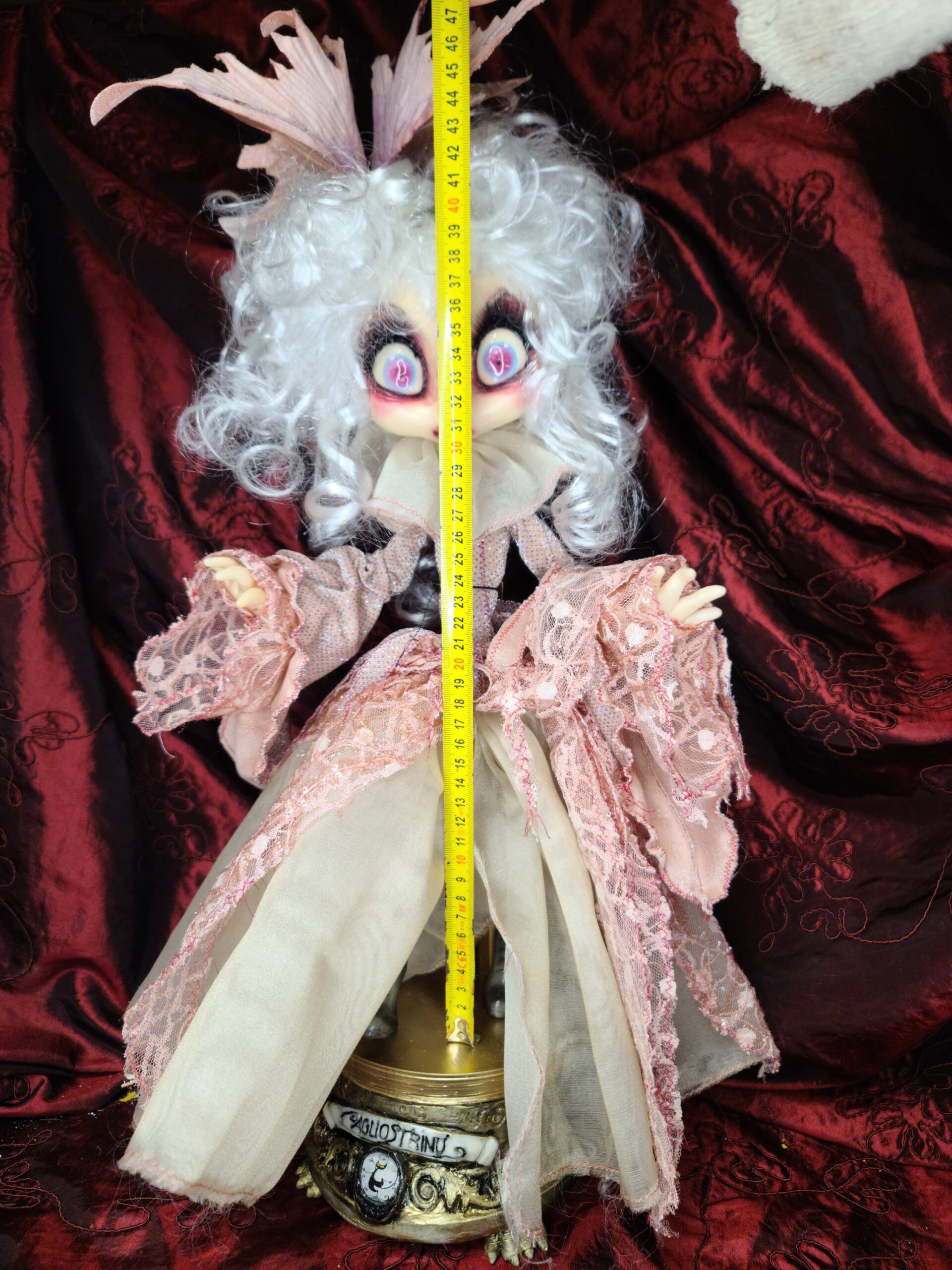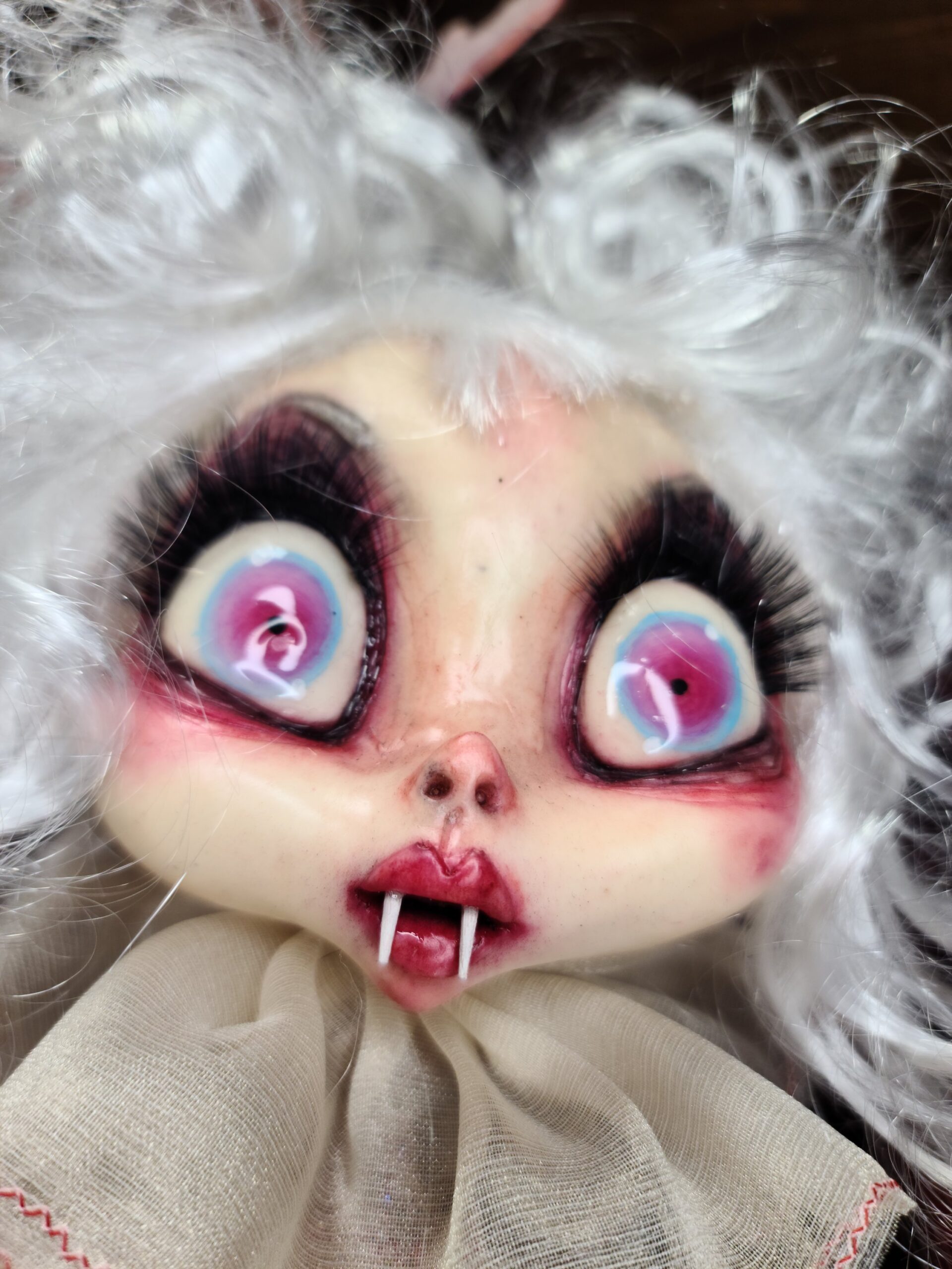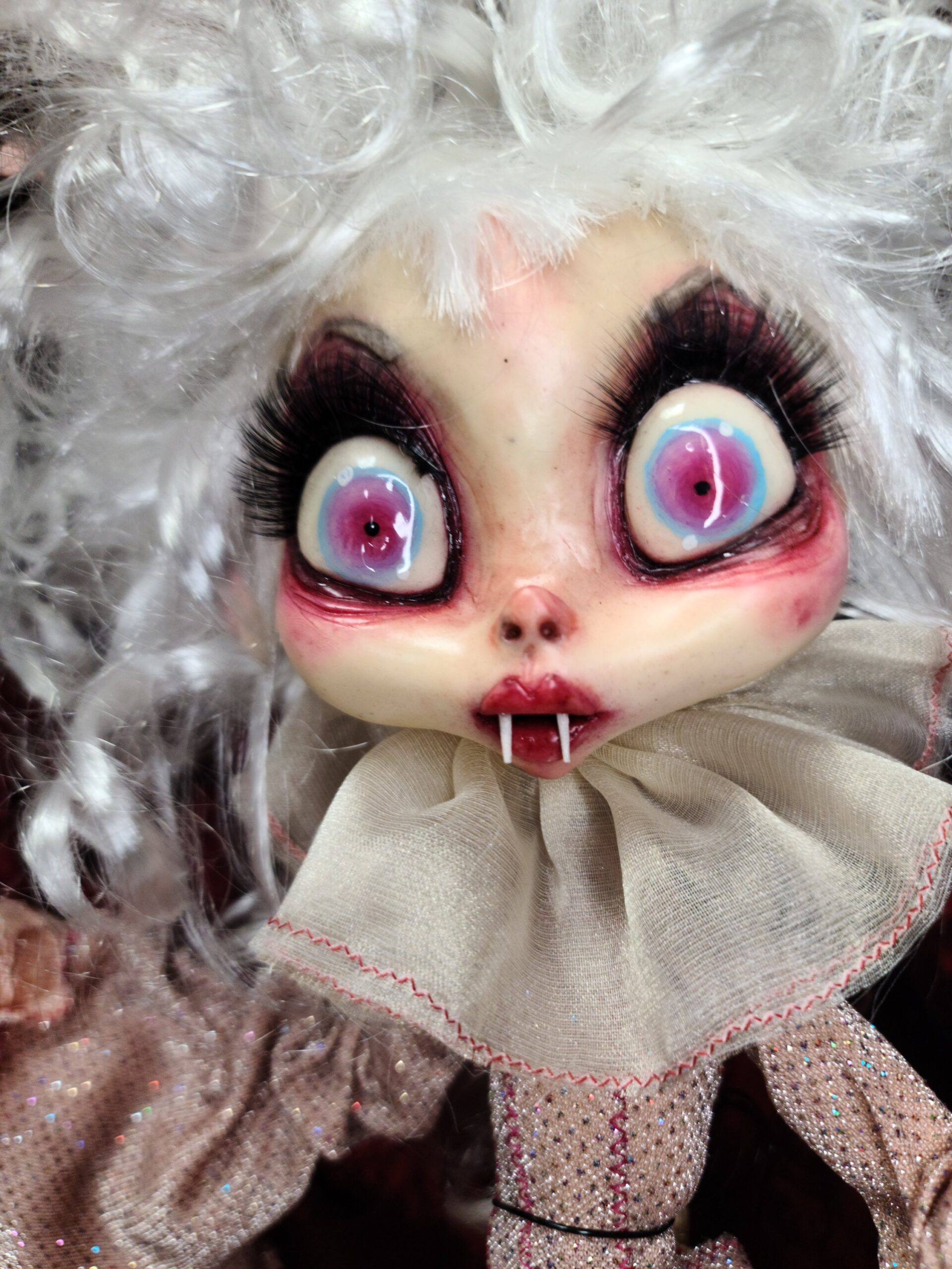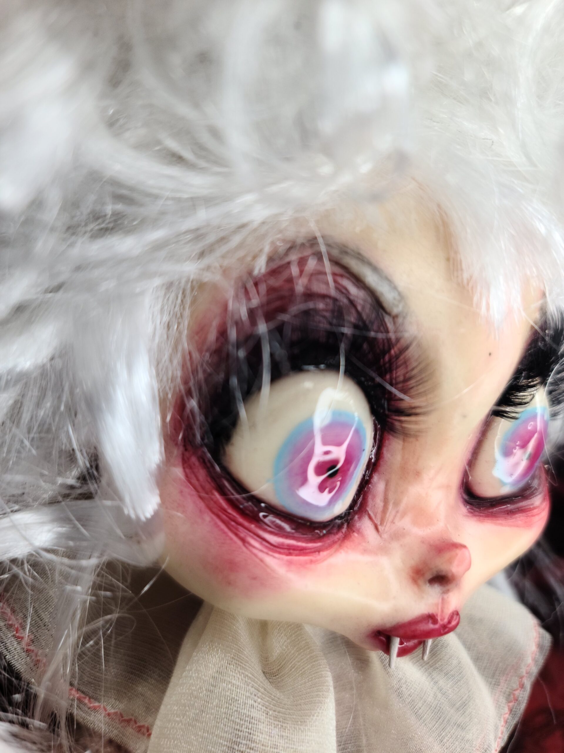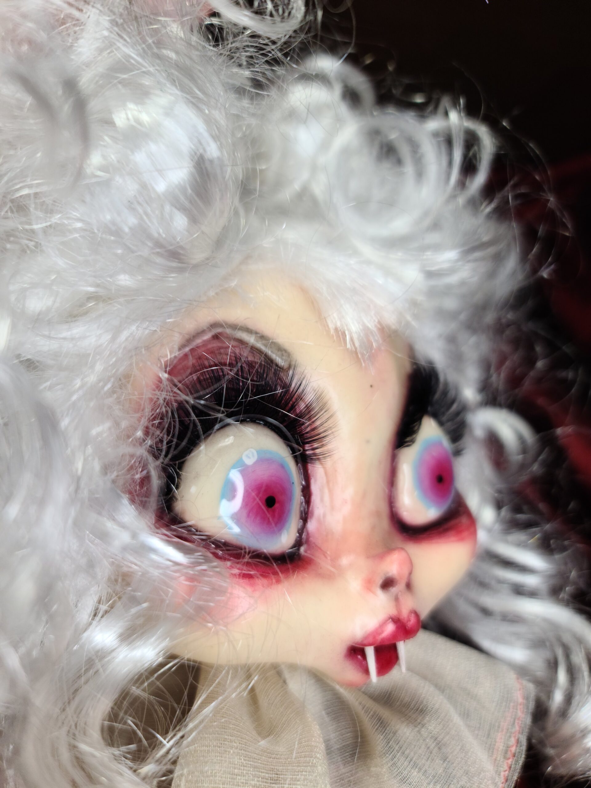Un pezzo unico di artigianato che fonde eleganza e oscurità: FalenRose, una vampira eterea dagli occhi ipnotici e dall’abito ricco di tessuti morbidi, pizzi e trasparenze nei toni rosati. Il volto, caratterizzato da un design espressivo e studiato nei minimi dettagli per enfatizzare il suo fascino gotico-fiabesco, insieme alle mani in resina, alla parrucca bianca vaporosa e a ogni piega del vestito, è il risultato del lavoro meticoloso di Serena Pieruccini, che ha progettato, modellato, cucito e assemblato ogni elemento con precisione sartoriale.