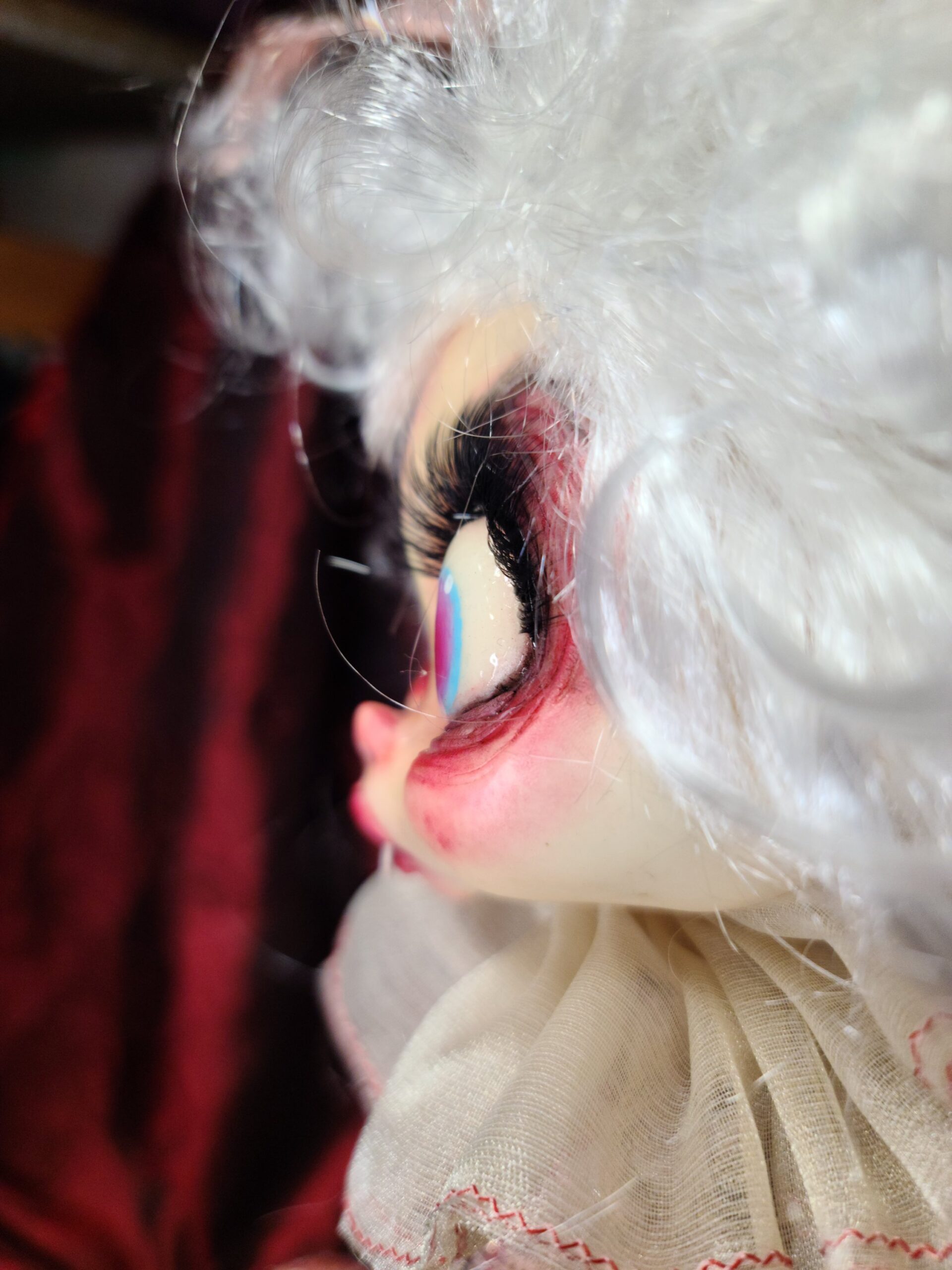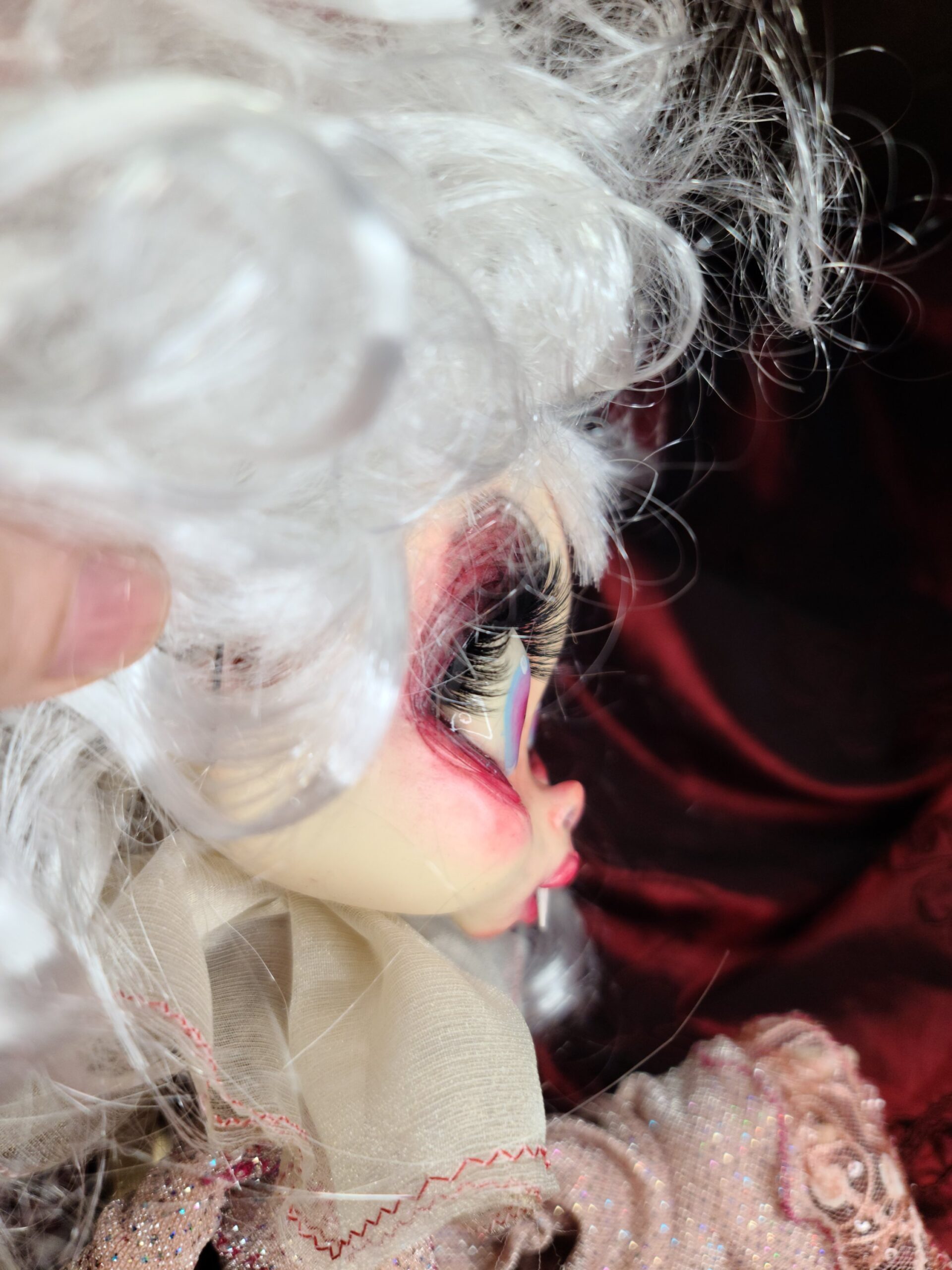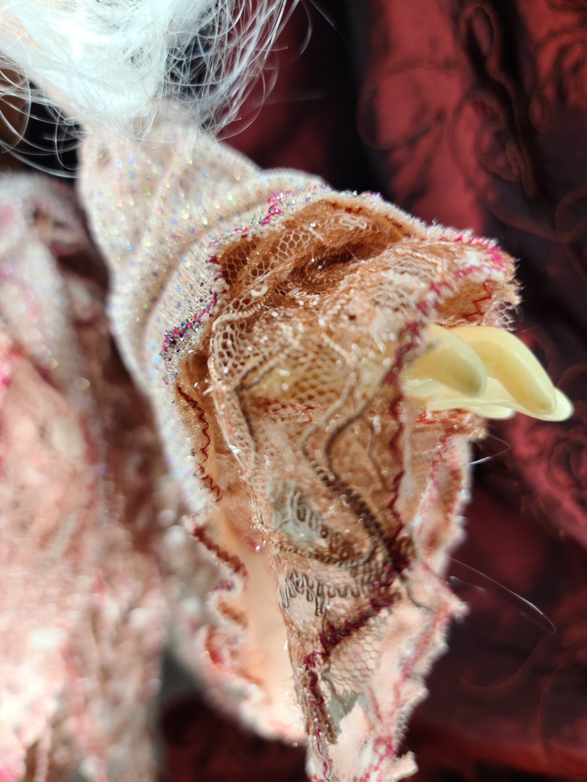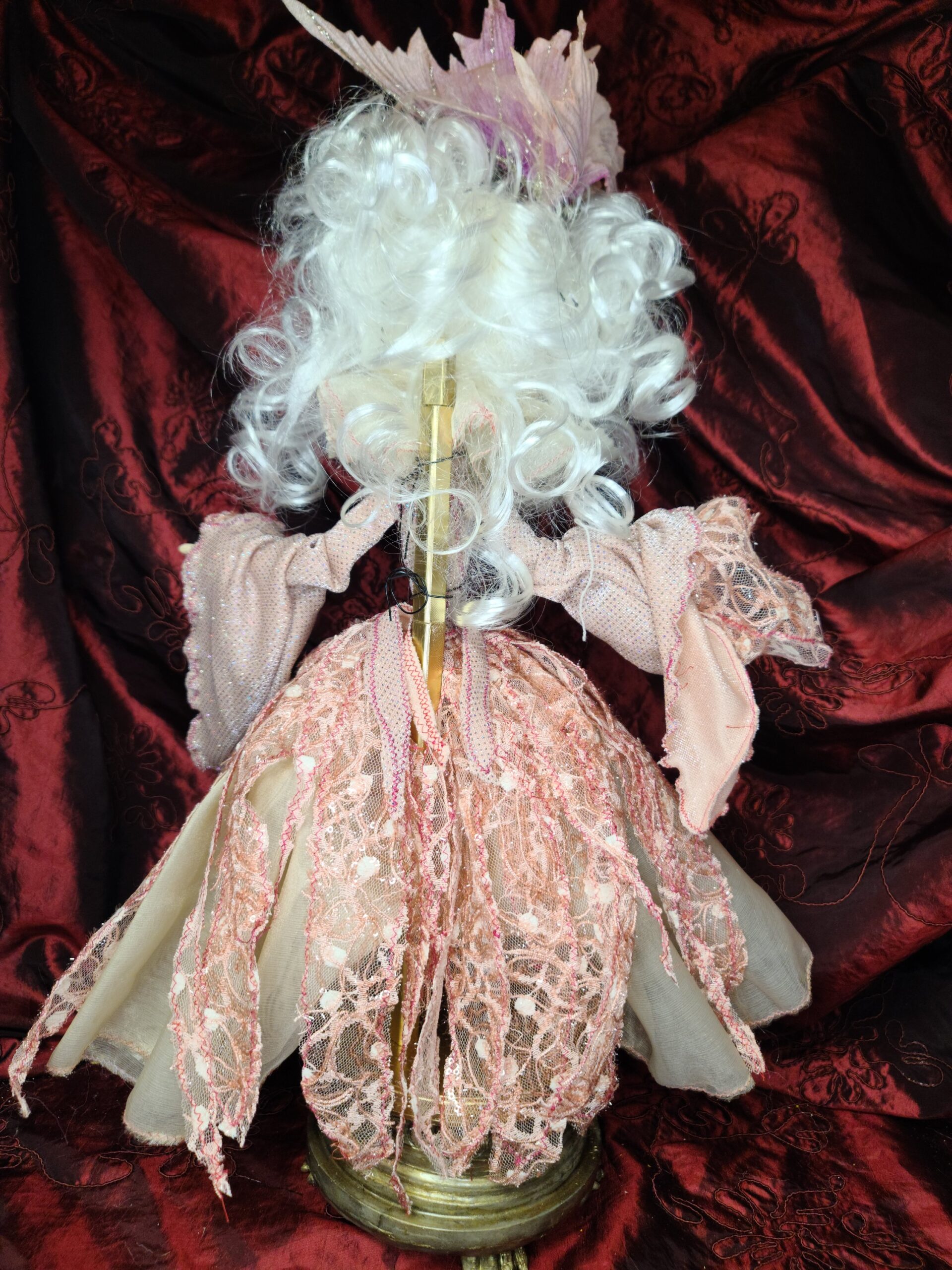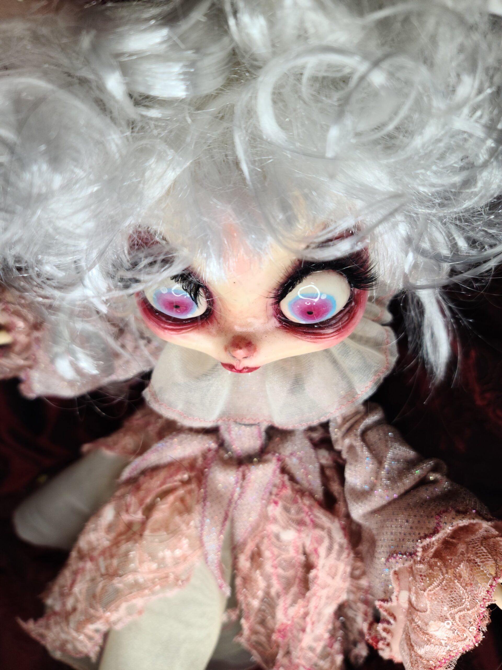 Un pezzo unico di artigianato che fonde eleganza e oscurità: FalenRose, una vampira eterea dagli occhi ipnotici e dall’abito ricco di tessuti morbidi, pizzi e trasparenze nei toni rosati. Il volto, caratterizzato da un design espressivo e studiato nei minimi dettagli per enfatizzare il suo fascino gotico-fiabesco, insieme alle mani in resina, alla parrucca bianca vaporosa e a ogni piega del vestito, è il risultato del lavoro meticoloso di Serena Pieruccini, che ha progettato, modellato, cucito e assemblato ogni elemento con precisione sartoriale.