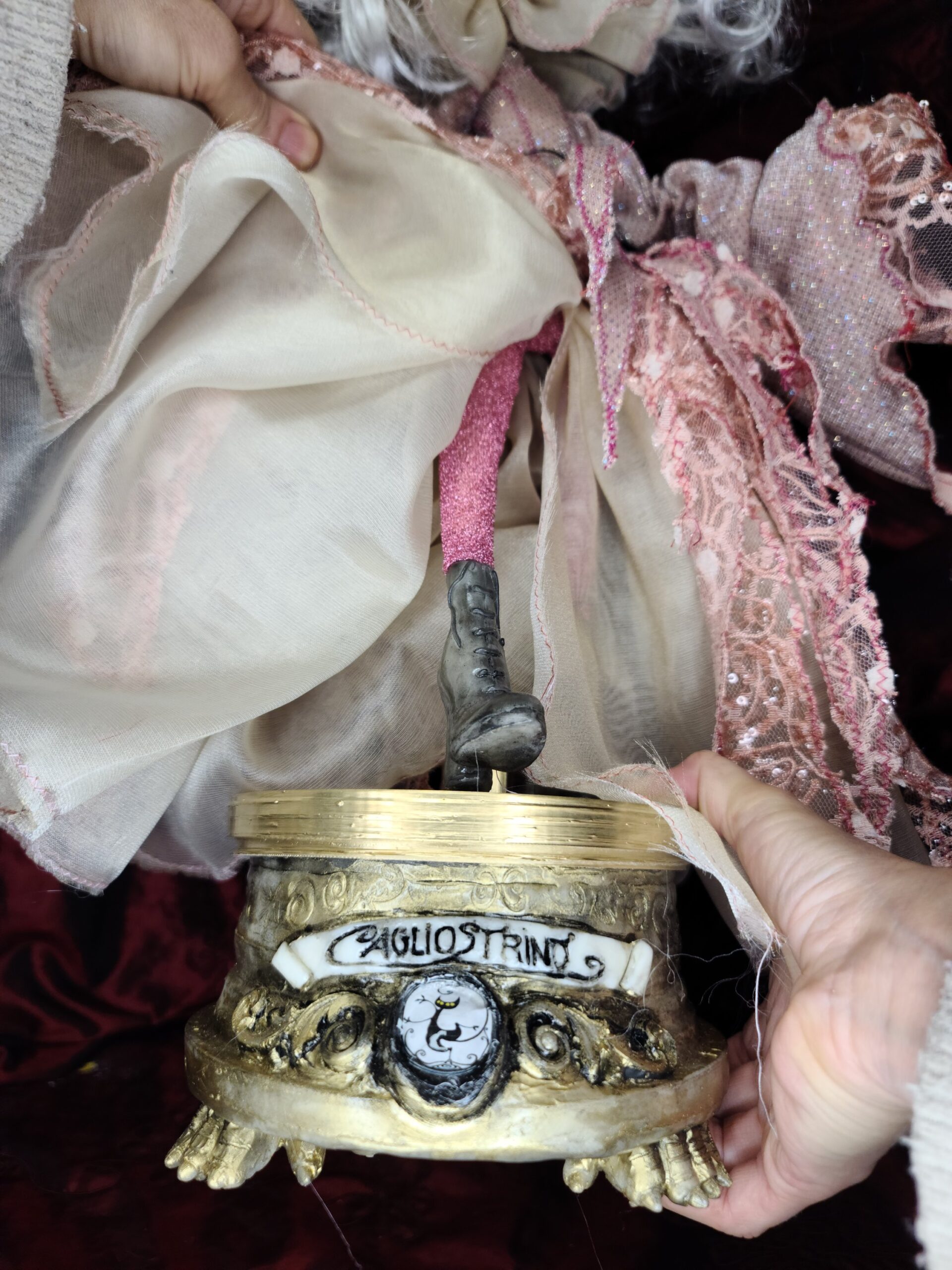 FalenRose è snodabile e riposizionabile, pensata come pezzo da collezione dal forte impatto scenico. La bambola viene venduta con il suo stand artigianale, un supporto apribile che sostiene la bambola in esposizione e che può essere usato come piccolo cofanetto per riporre oggetti o accessori. Una creazione unica, sospesa tra gotico, poesia e artigianato d’autore: un pezzo unico irripetibile nel suo stile.