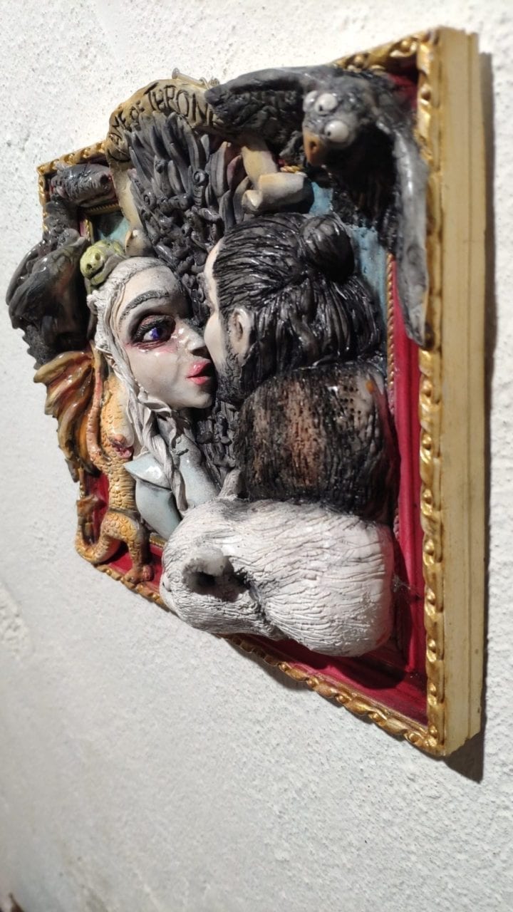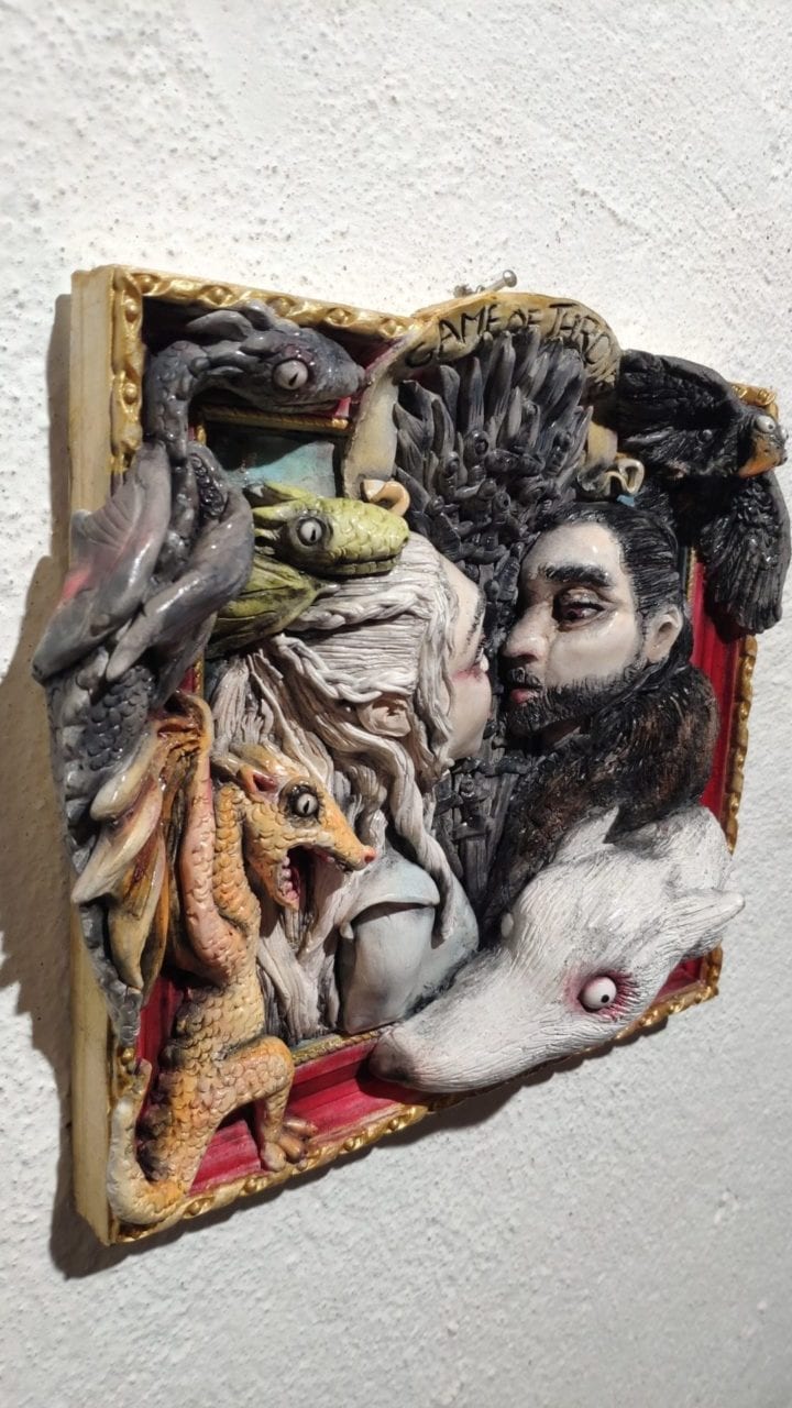 Un quadro tridimensionale artigianale dedicato a Il Trono di Spade – Game of Thrones, con i suoi protagonisti più amati raffigurati in primo piano: Daenerys Targaryen con i suoi draghi e Jon Snow, sullo sfondo l’iconico Trono di Ferro, simbolo assoluto della saga creata da George R.R. Martin. Questa è una personale interpretazione dei personaggi di Game of Thrones realizzata da Serena Pieruccini, che ne cattura intensità, tensione narrativa e fascino epico con uno stile unico e vibrante. Un quadro tridimensionale artigianale ideale per chi ama le grandi saghe fantasy, le battaglie per il potere e le storie scolpite nel destino.