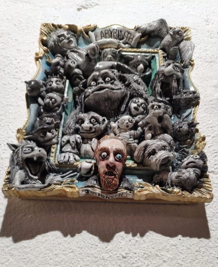 Un quadro tridimensionale artigianale dedicato a Labyrinth – Dove tutto è possibile, il film cult diretto da Jim Henson. In questa scena sono raffigurati i personaggi principali: David Bowie nel ruolo di Jareth, Re degli Gnomi, con il suo magnetismo inconfondibile, e Jennifer Connelly nel ruolo di Sarah Williams, la giovane eroina del Labirinto. Accanto a loro compaiono due delle creature più iconiche del film – Bubo, il gigante buono, e Gogol, il troll/goblin dall’espressione furba – insieme a una miriade di altri personaggi che popolano il mondo fantastico dell’opera, ricreando l’atmosfera caotica, magica e irresistibile del film.