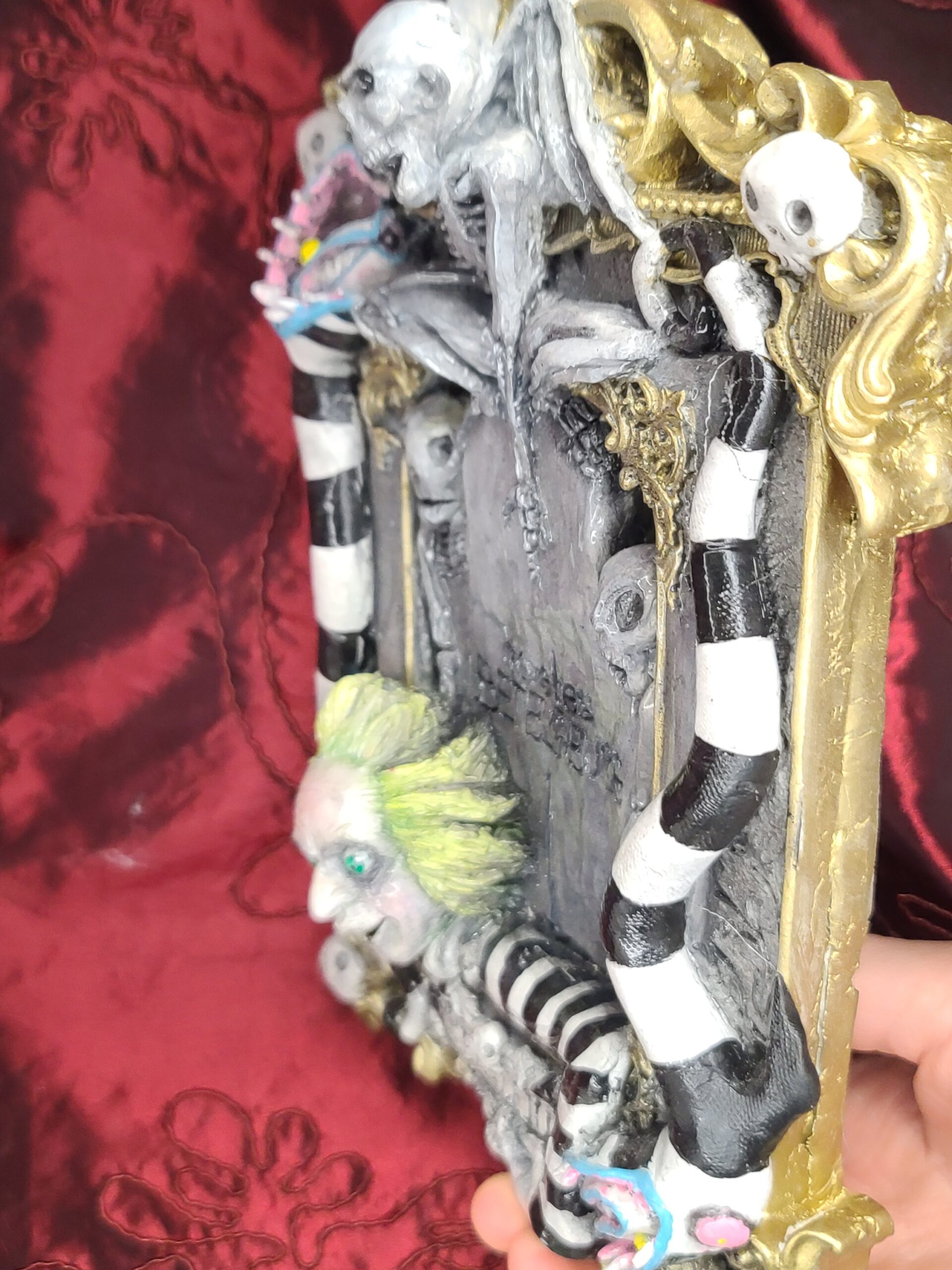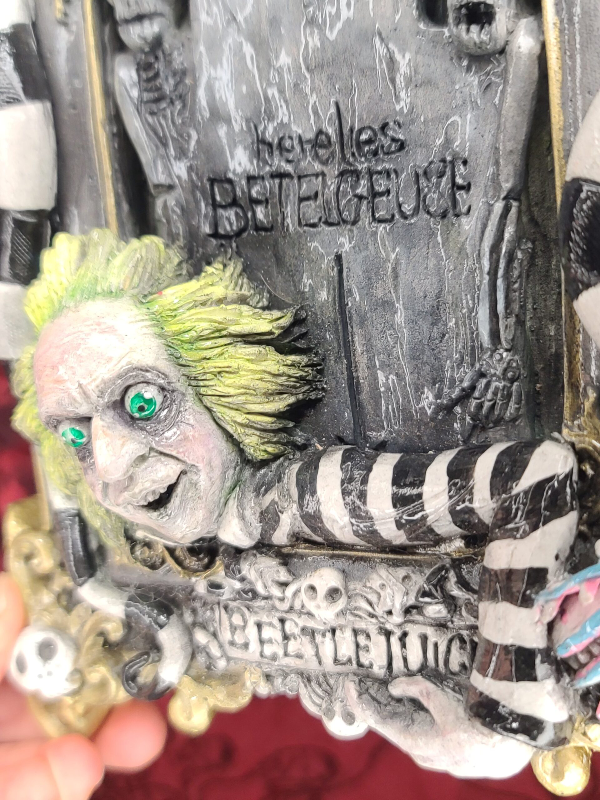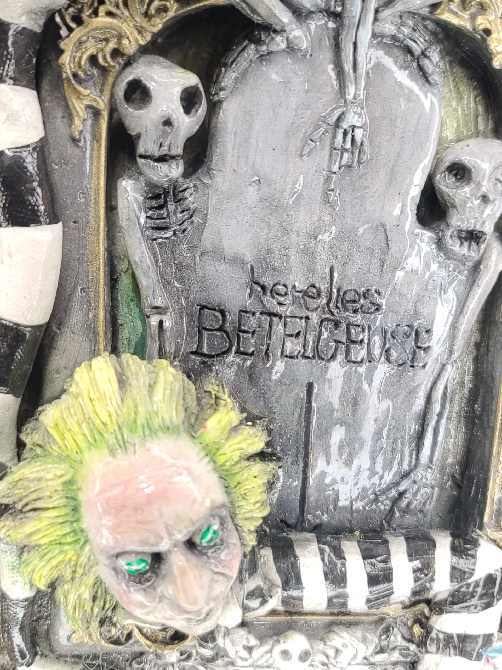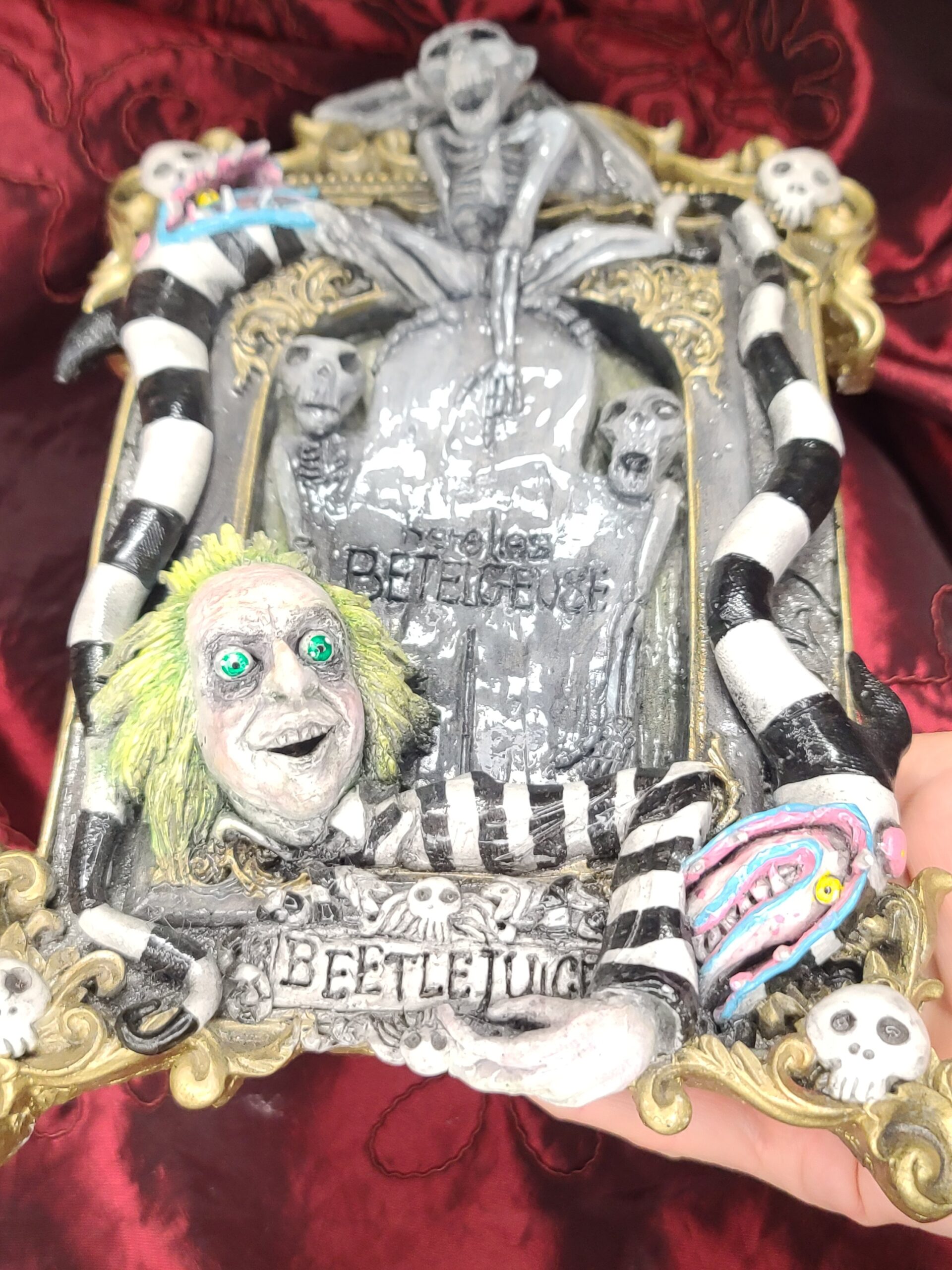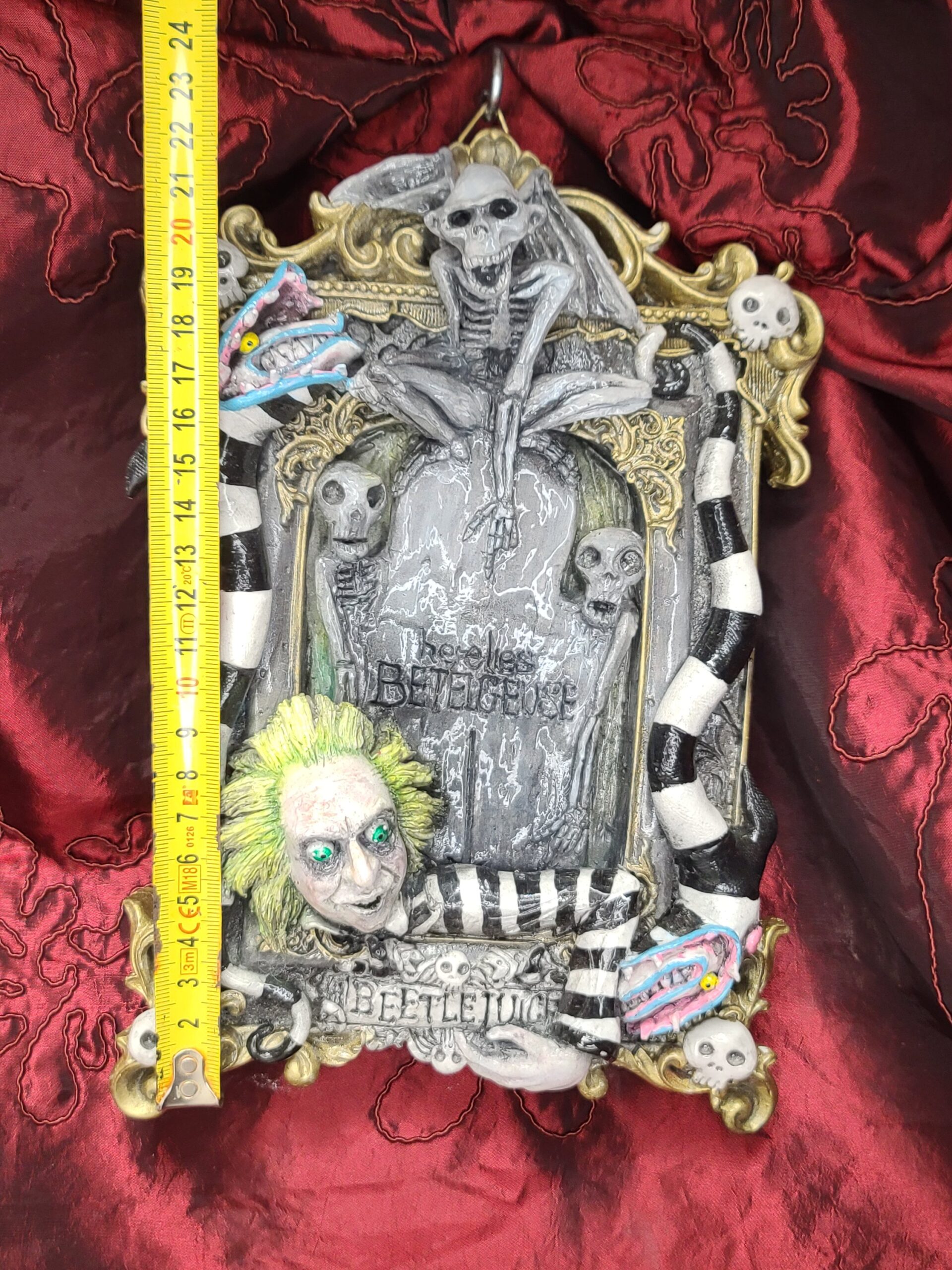 Un quadro tridimensionale artigianale dedicato a Beetlejuice, l’irriverente e caotico bio–esorcista del celebre film diretto da Tim Burton. In questa composizione, Beetlejuice emerge con il suo inconfondibile look: i capelli verde acido, lo sguardo spiritato e l’abito a righe bianche e nere, circondato da scheletri, teschietti e dettagli macabro–ironici che richiamano l’estetica del film. La tomba da cui spunta e l’atmosfera surreale della scena rievocano perfettamente il mondo stravagante e gotico che ha reso il personaggio un’icona intramontabile.