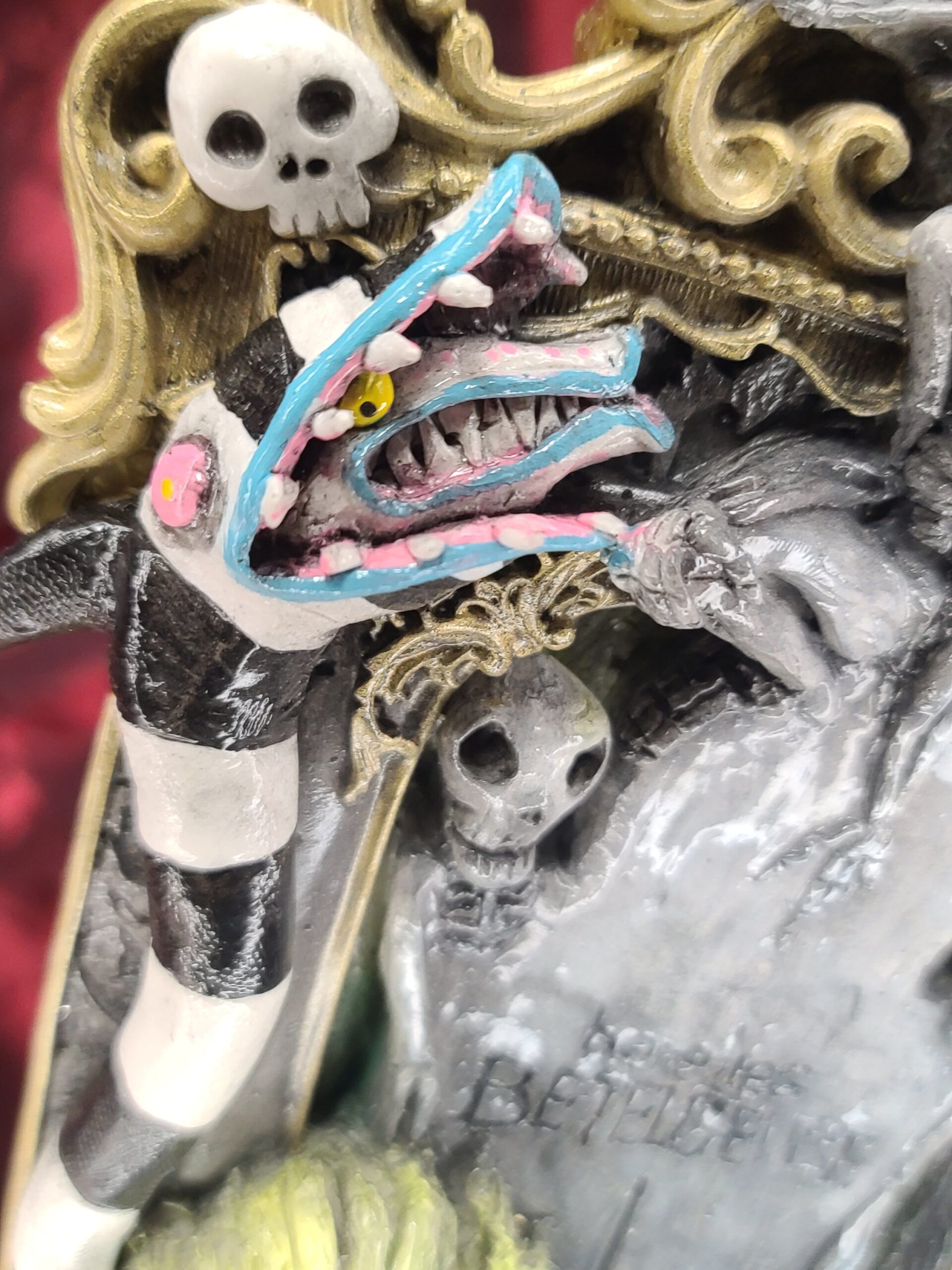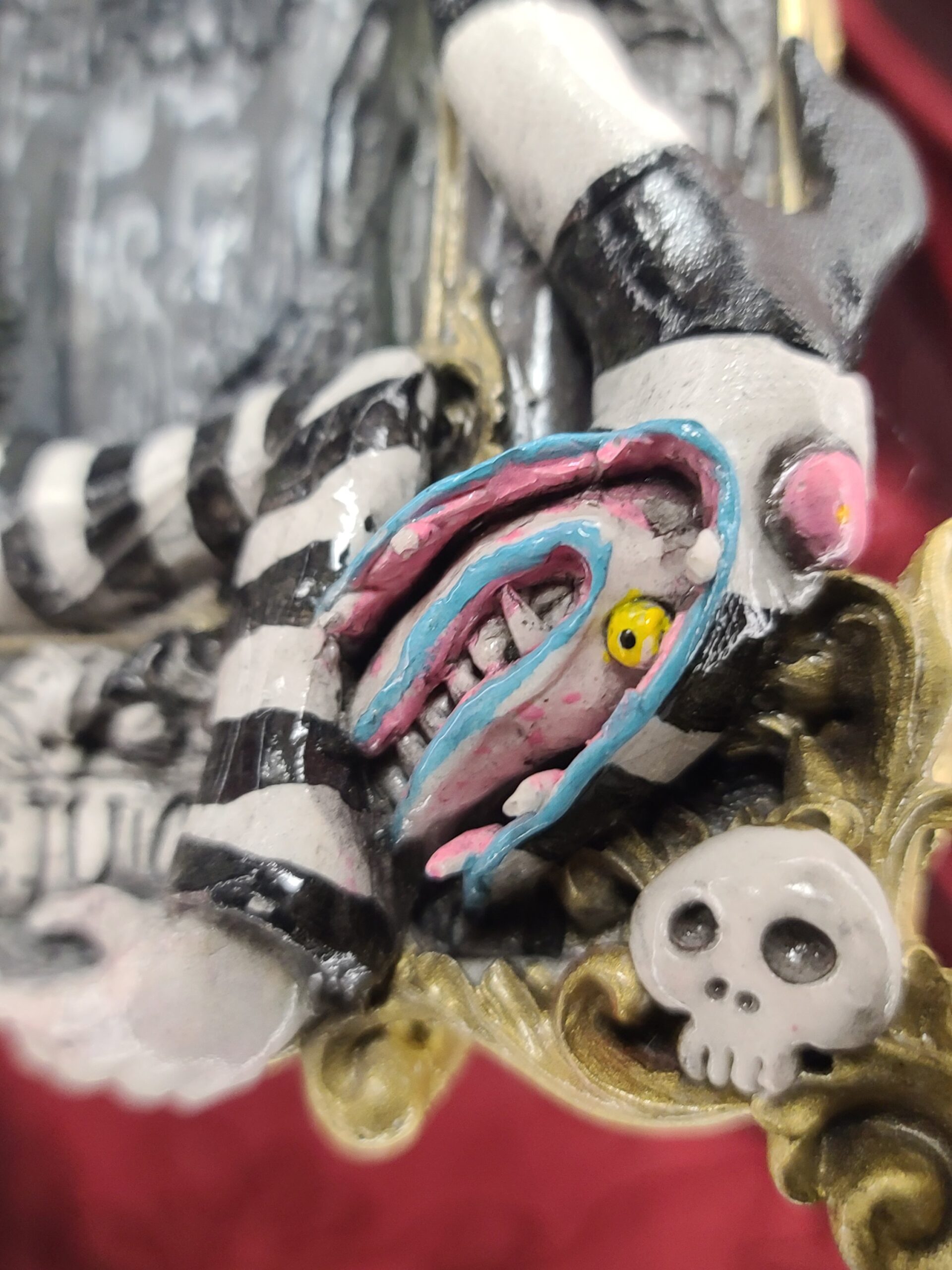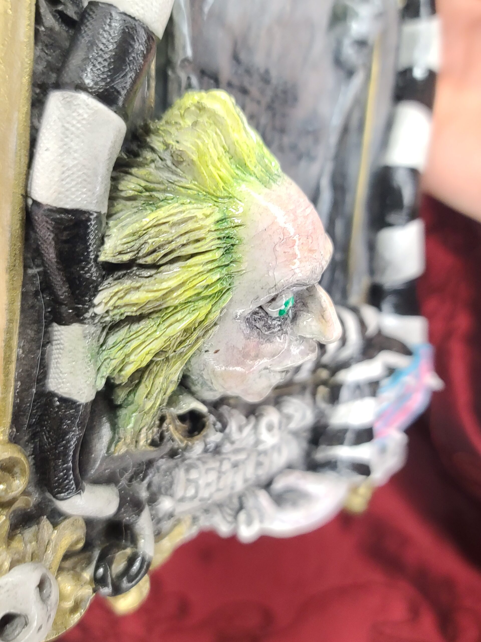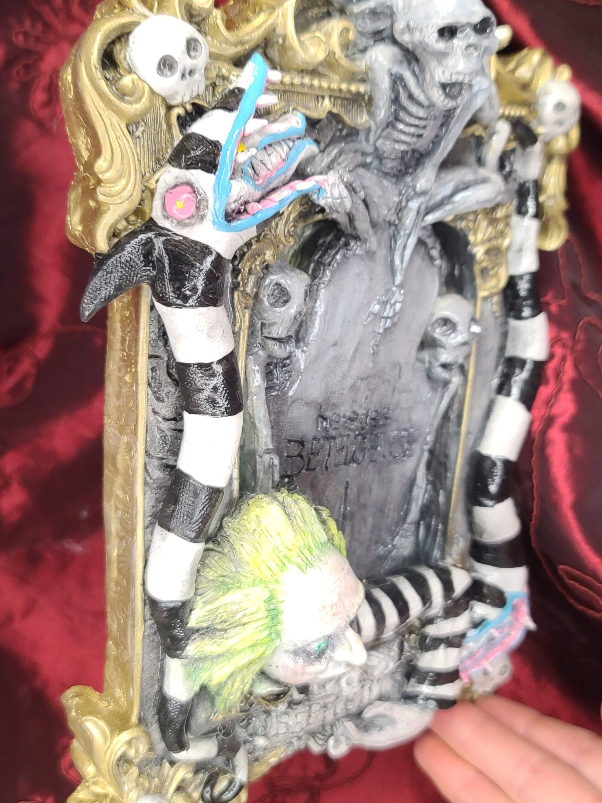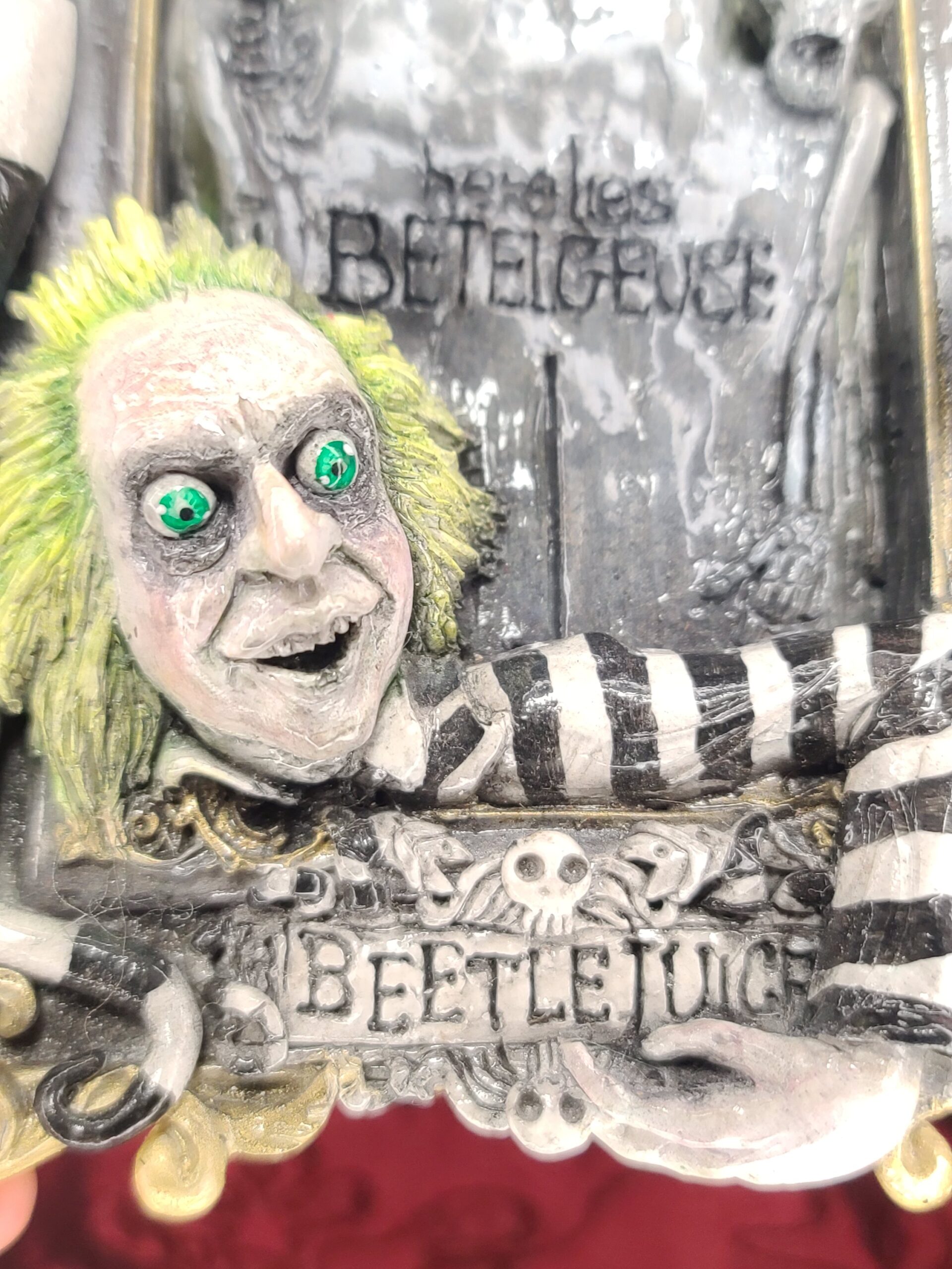 Un quadro tridimensionale artigianale dedicato a Beetlejuice, l’irriverente e caotico bio–esorcista del celebre film diretto da Tim Burton. In questa composizione, Beetlejuice emerge con il suo inconfondibile look: i capelli verde acido, lo sguardo spiritato e l’abito a righe bianche e nere, circondato da scheletri, teschietti e dettagli macabro–ironici che richiamano l’estetica del film. La tomba da cui spunta e l’atmosfera surreale della scena rievocano perfettamente il mondo stravagante e gotico che ha reso il personaggio un’icona intramontabile.