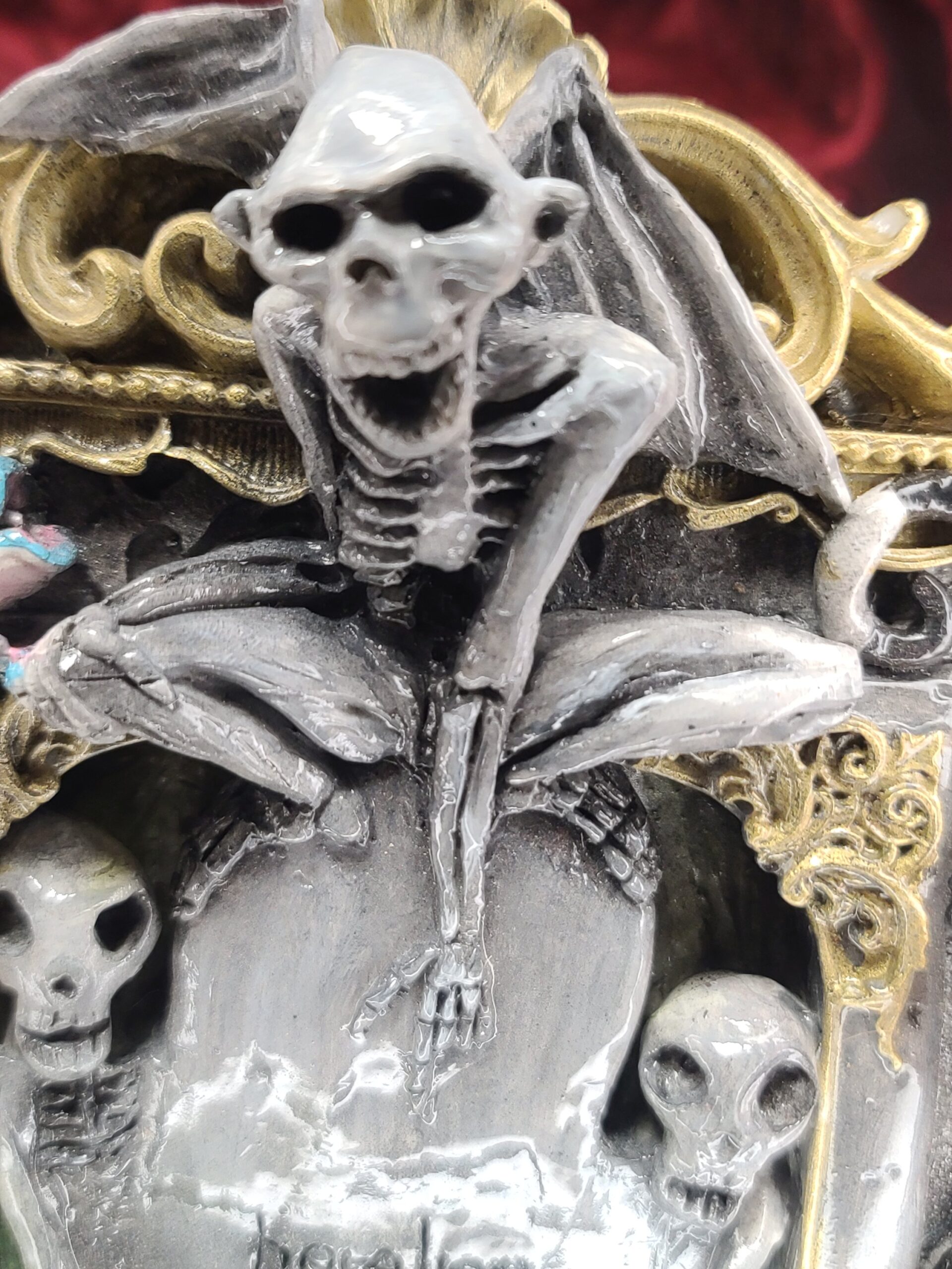 Il prodotto è rigorosamente fatto a mano da Serena Pieruccini, che ha seguito tutte le fasi: progettazione, modellazione, realizzazione dello stampo in gomma siliconica, colaggio in resina, colorazione e finitura. Ogni dettaglio — dalle ossa scolpite ai colori accesi, fino all’espressione inconfondibile del personaggio — è frutto di cura, precisione e grande sensibilità artistica.