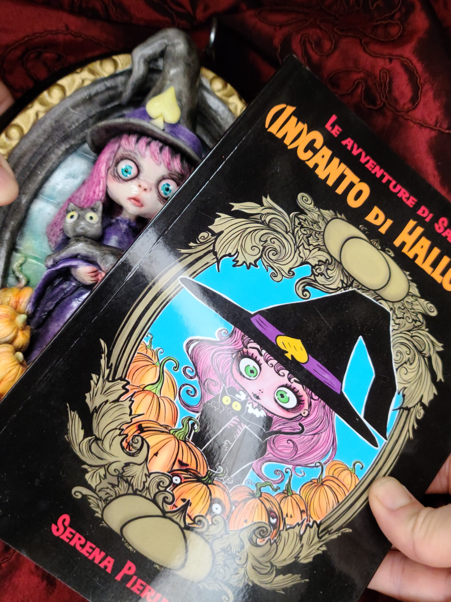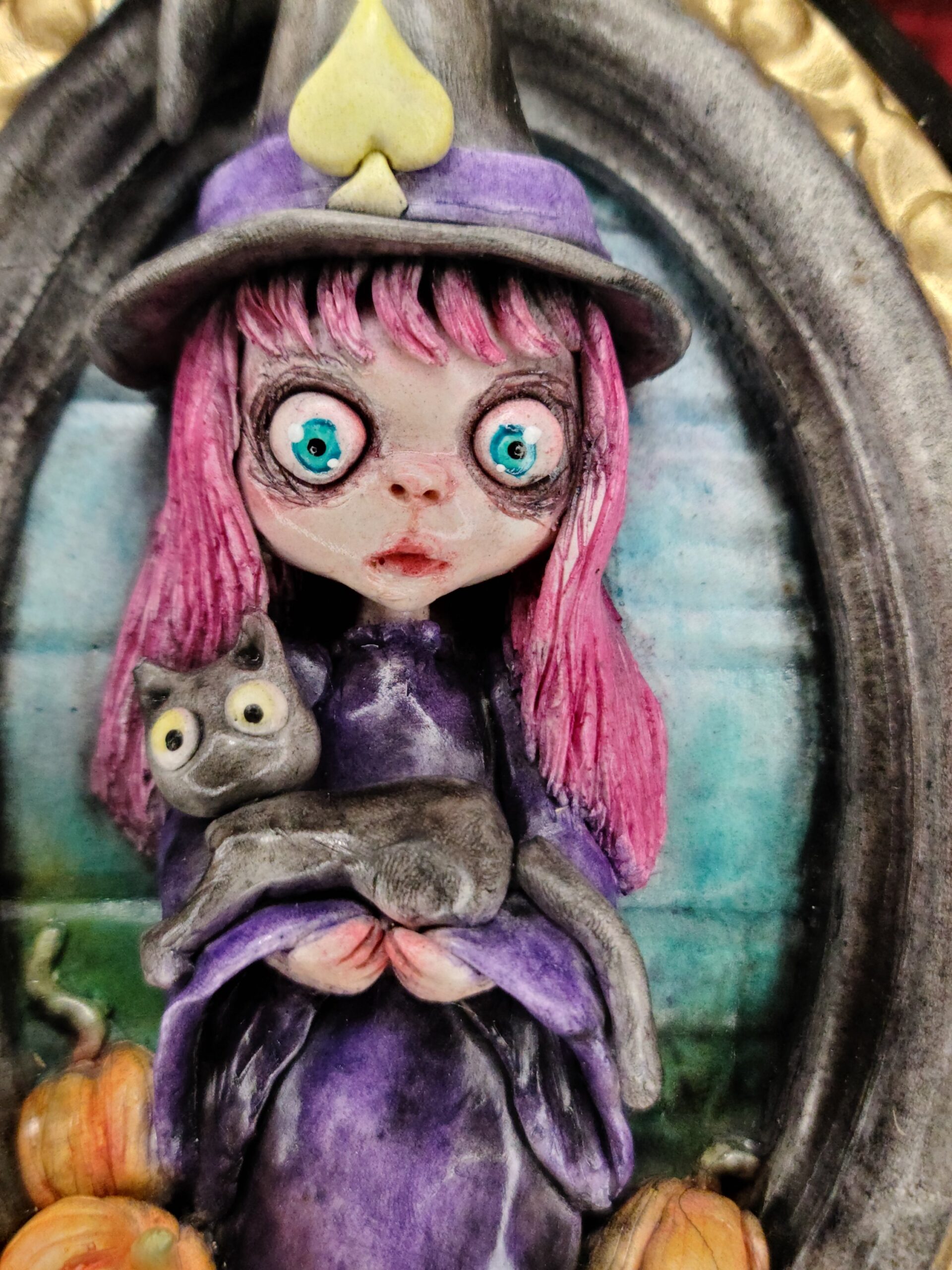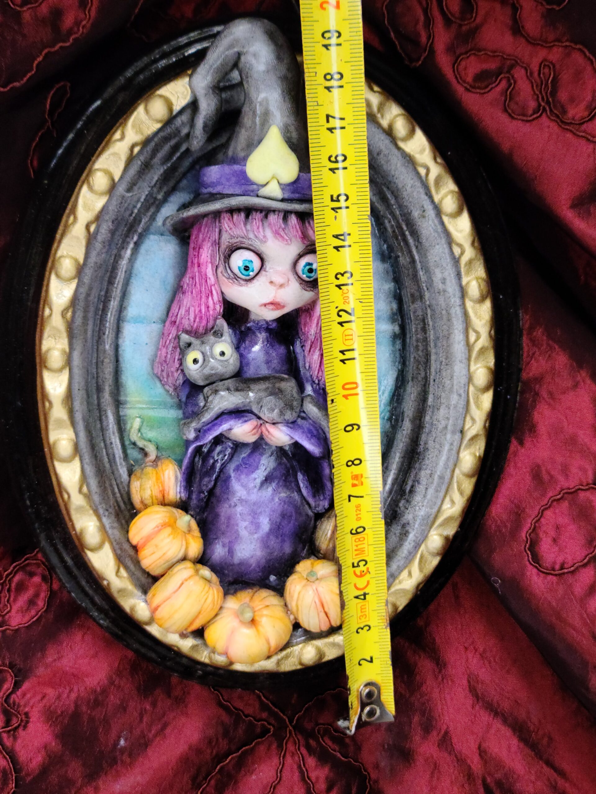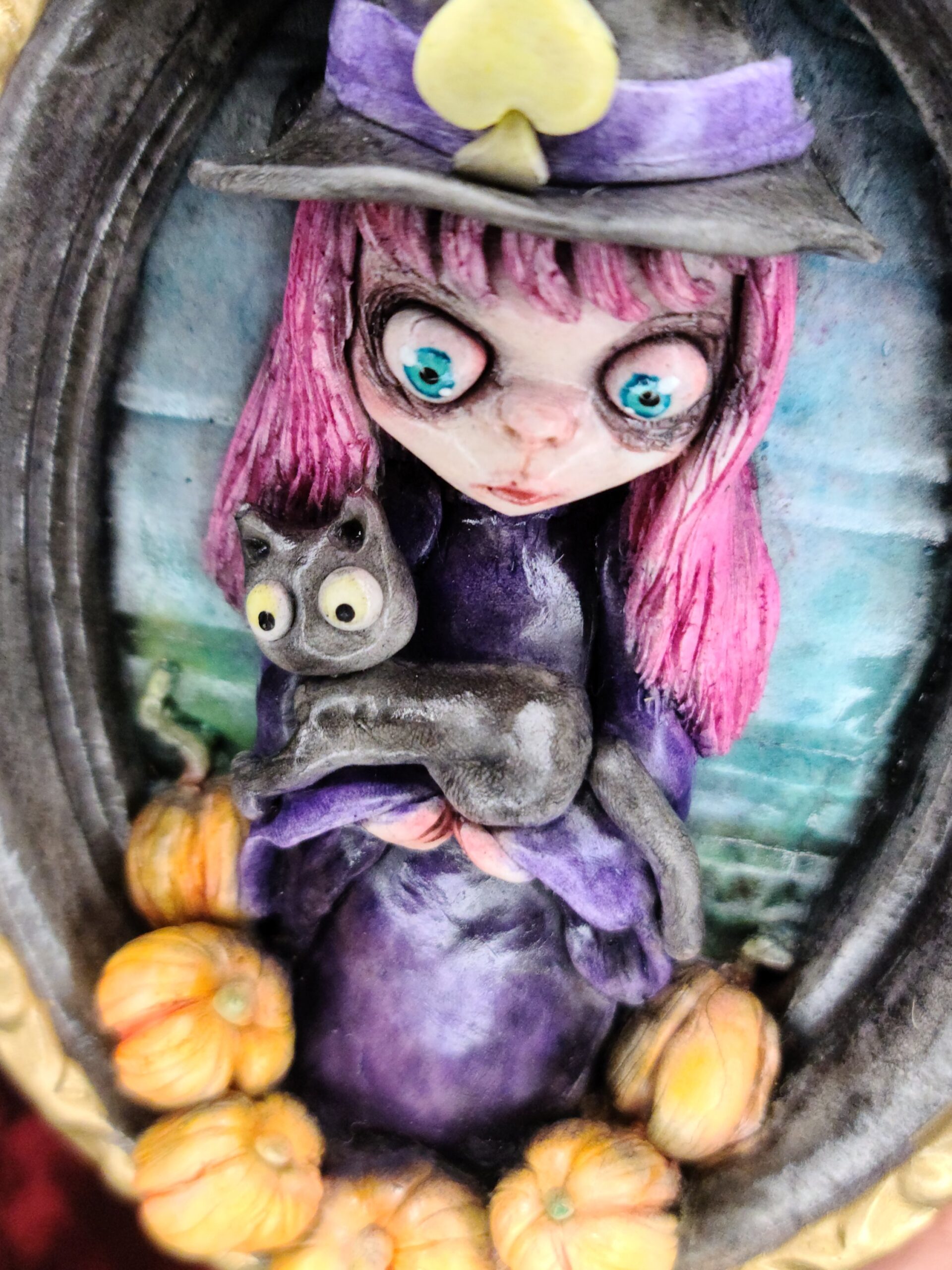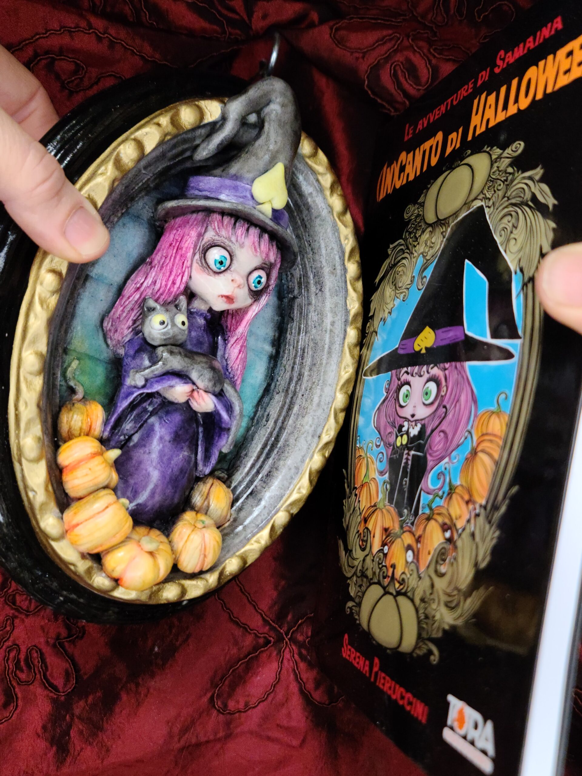 Un quadro tridimensionale artigianale dedicato a Samaina, la piccola streghetta protagonista della serie di libri Le Avventure di Samaina, scritta e illustrata da Serena Pieruccini. Raffigurata con il suo inconfondibile cappello a punta, il vestito viola e il fidato gatto Mimo tra le braccia — sempre pronto a imitare ogni sua mossa — Samaina appare circondata da piccole zucche, un dettaglio che richiama l’atmosfera magica e luminosa che caratterizza il suo mondo incantato.