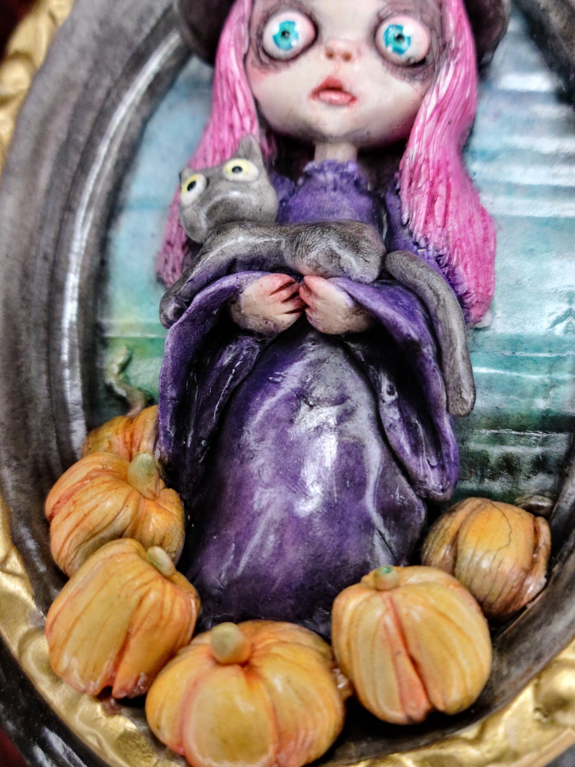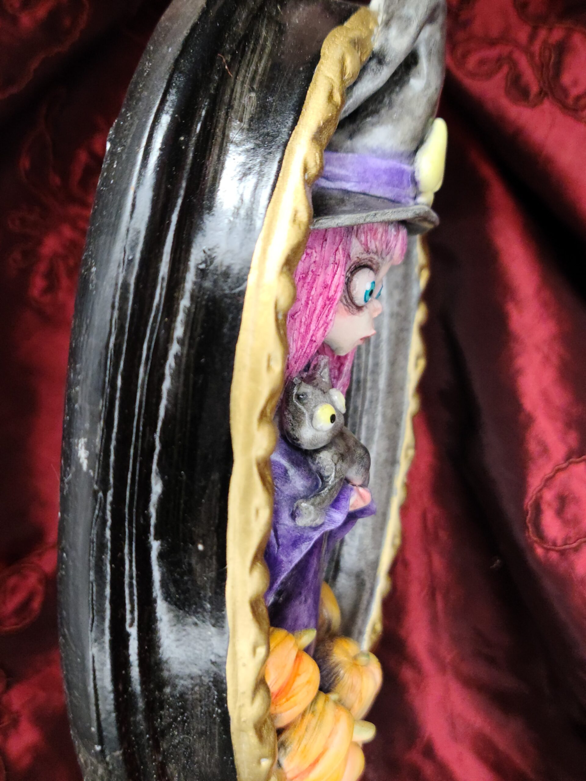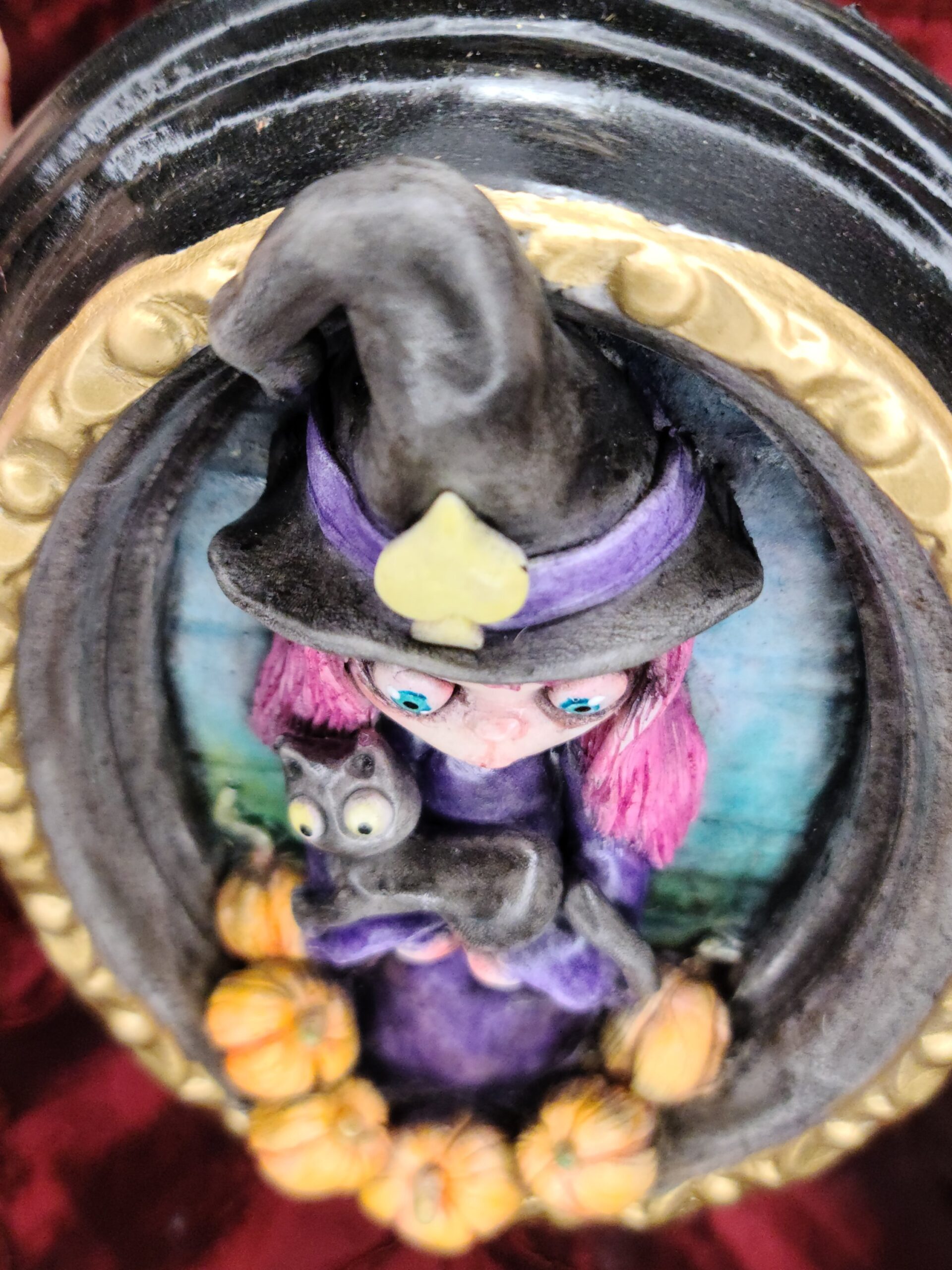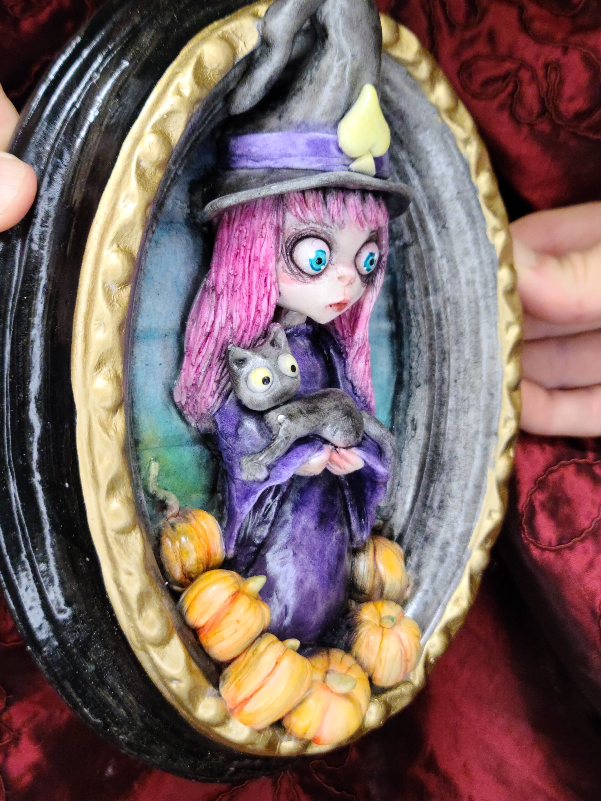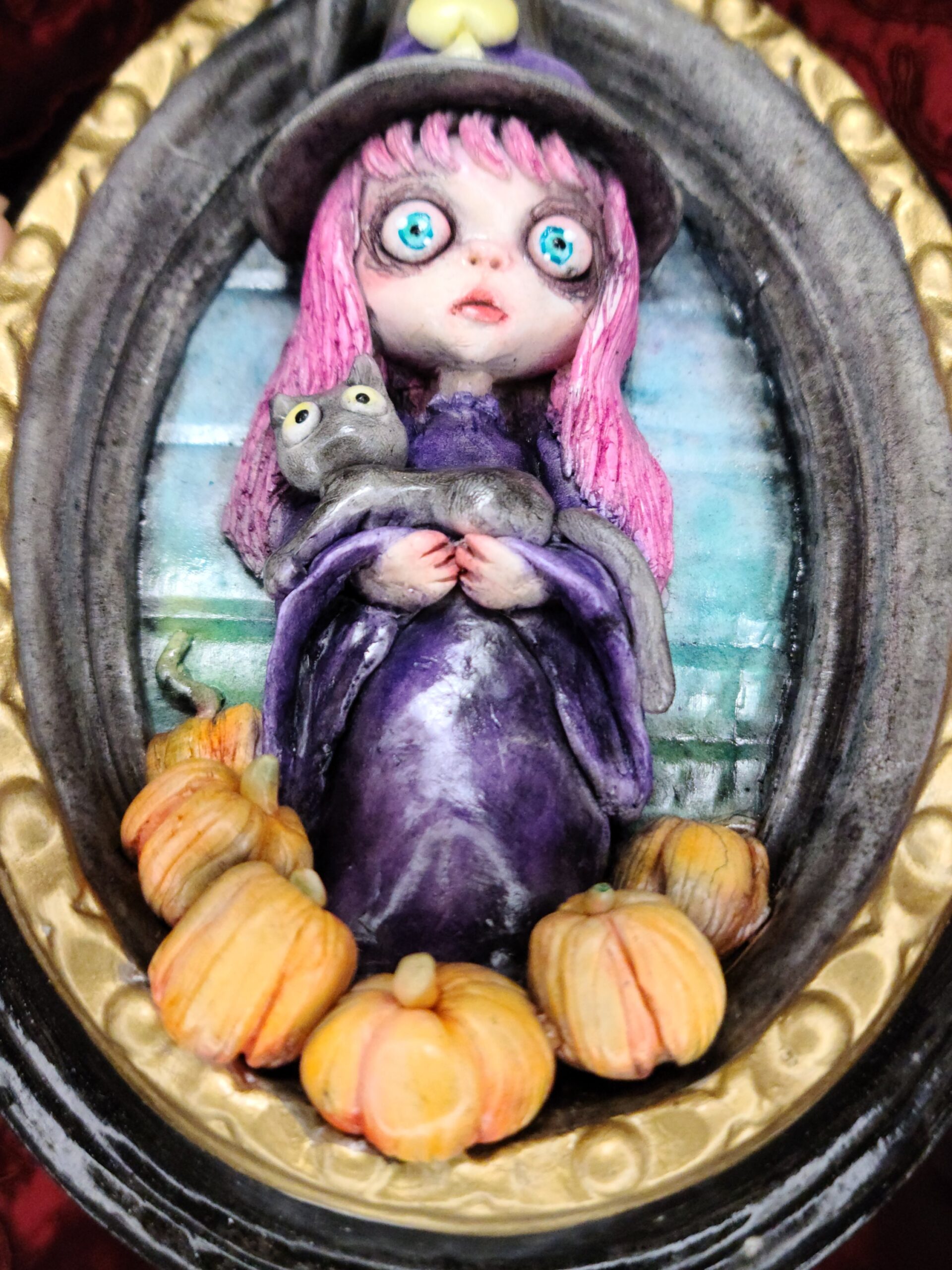 Un quadro tridimensionale artigianale dedicato a Samaina, la piccola streghetta protagonista della serie di libri Le Avventure di Samaina, scritta e illustrata da Serena Pieruccini. Raffigurata con il suo inconfondibile cappello a punta, il vestito viola e il fidato gatto Mimo tra le braccia — sempre pronto a imitare ogni sua mossa — Samaina appare circondata da piccole zucche, un dettaglio che richiama l’atmosfera magica e luminosa che caratterizza il suo mondo incantato.
