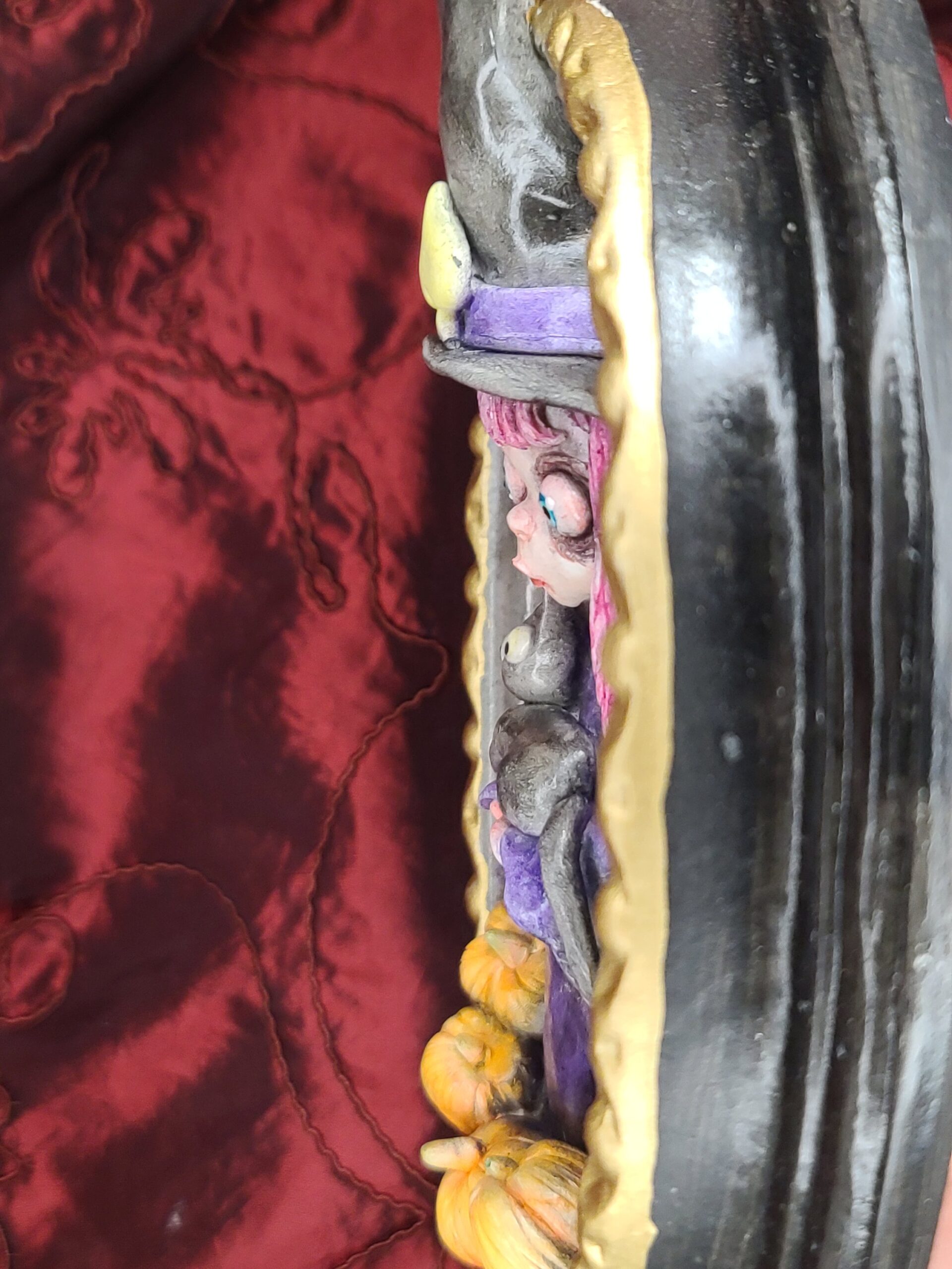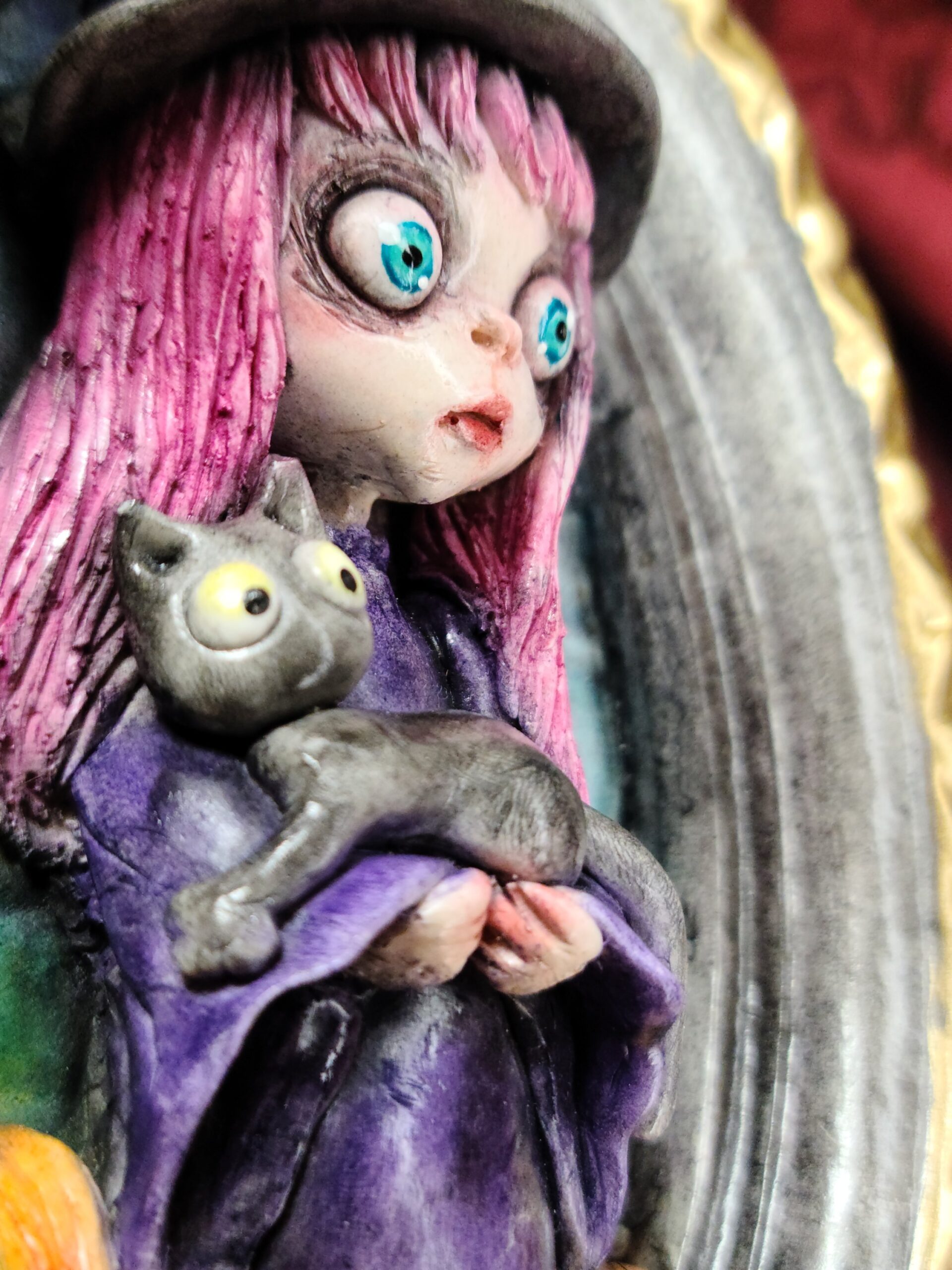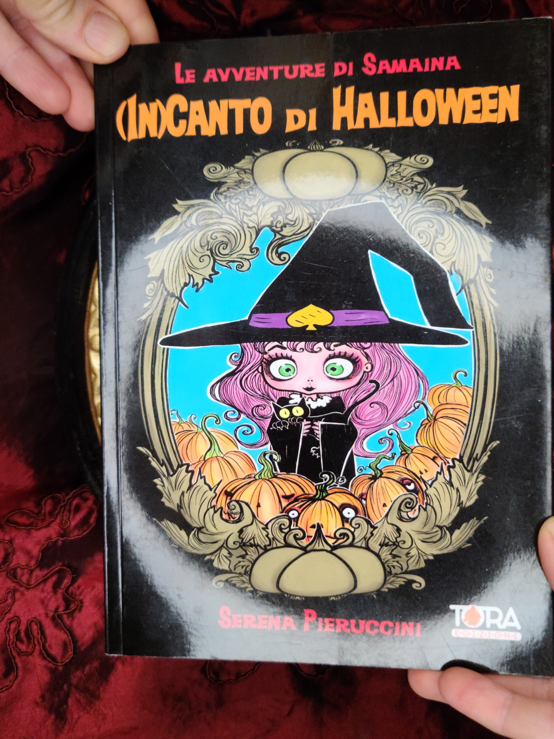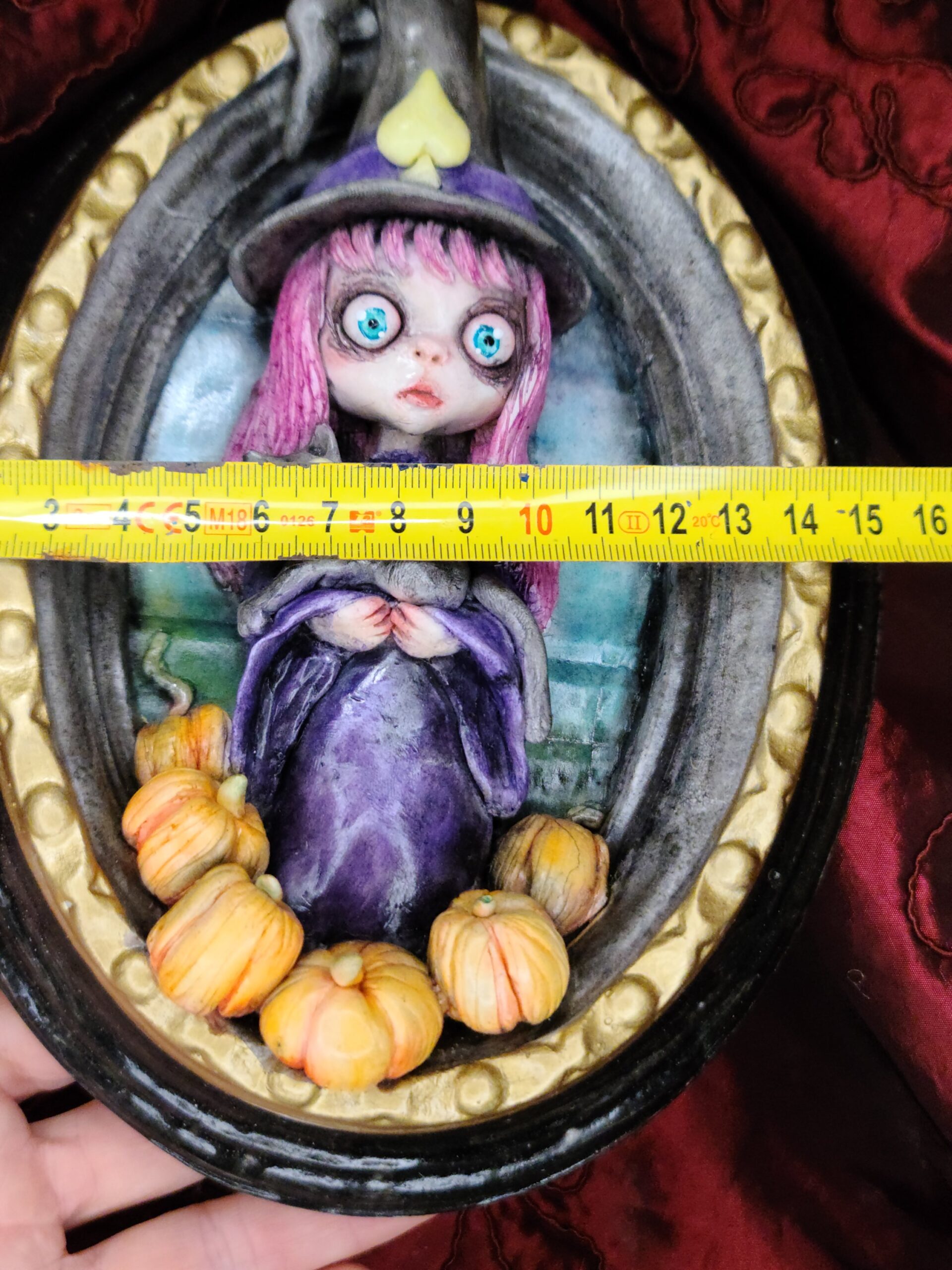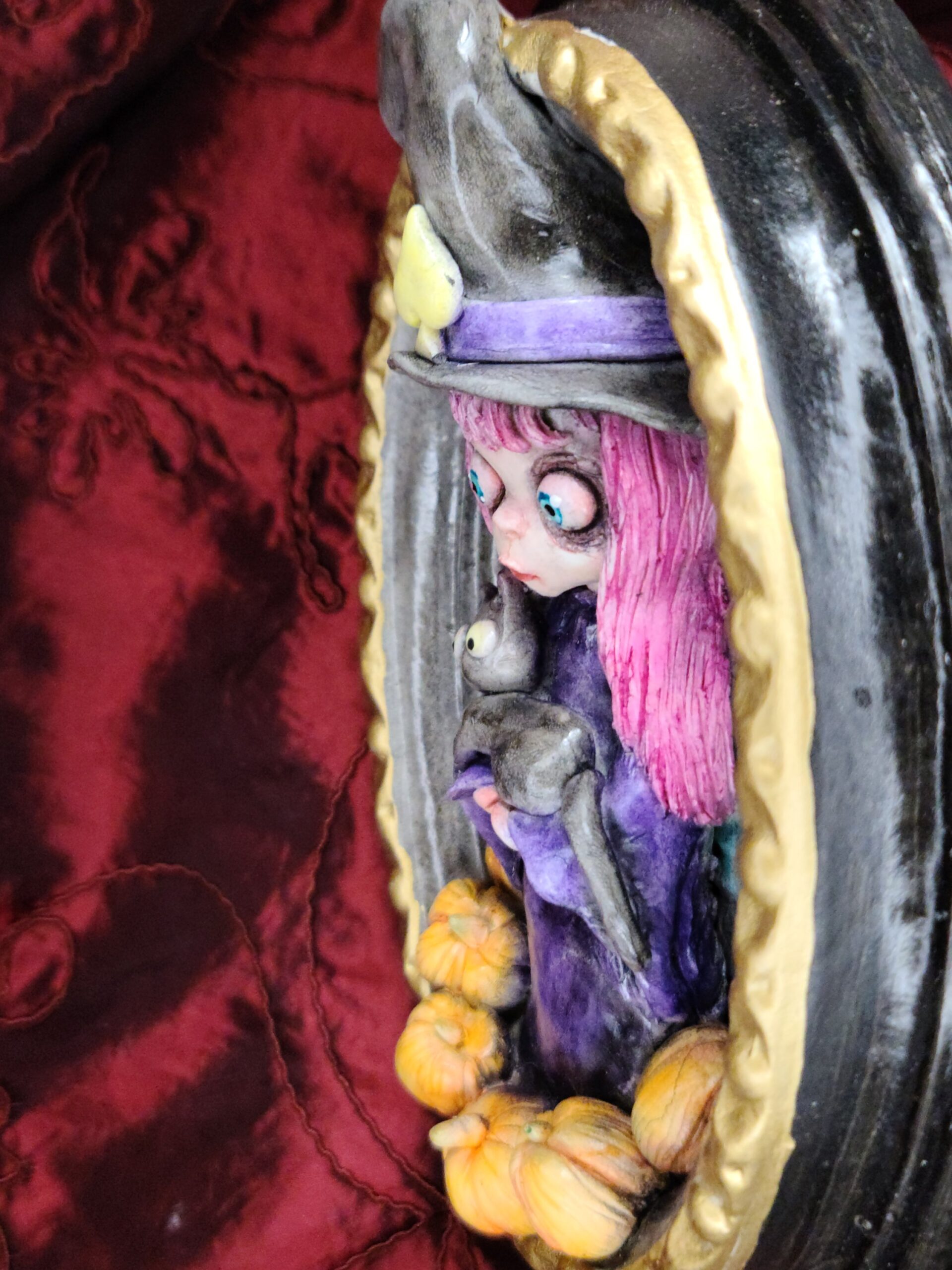 Un quadro tridimensionale artigianale dedicato a Samaina, la piccola streghetta protagonista della serie di libri Le Avventure di Samaina, scritta e illustrata da Serena Pieruccini. Raffigurata con il suo inconfondibile cappello a punta, il vestito viola e il fidato gatto Mimo tra le braccia — sempre pronto a imitare ogni sua mossa — Samaina appare circondata da piccole zucche, un dettaglio che richiama l’atmosfera magica e luminosa che caratterizza il suo mondo incantato.