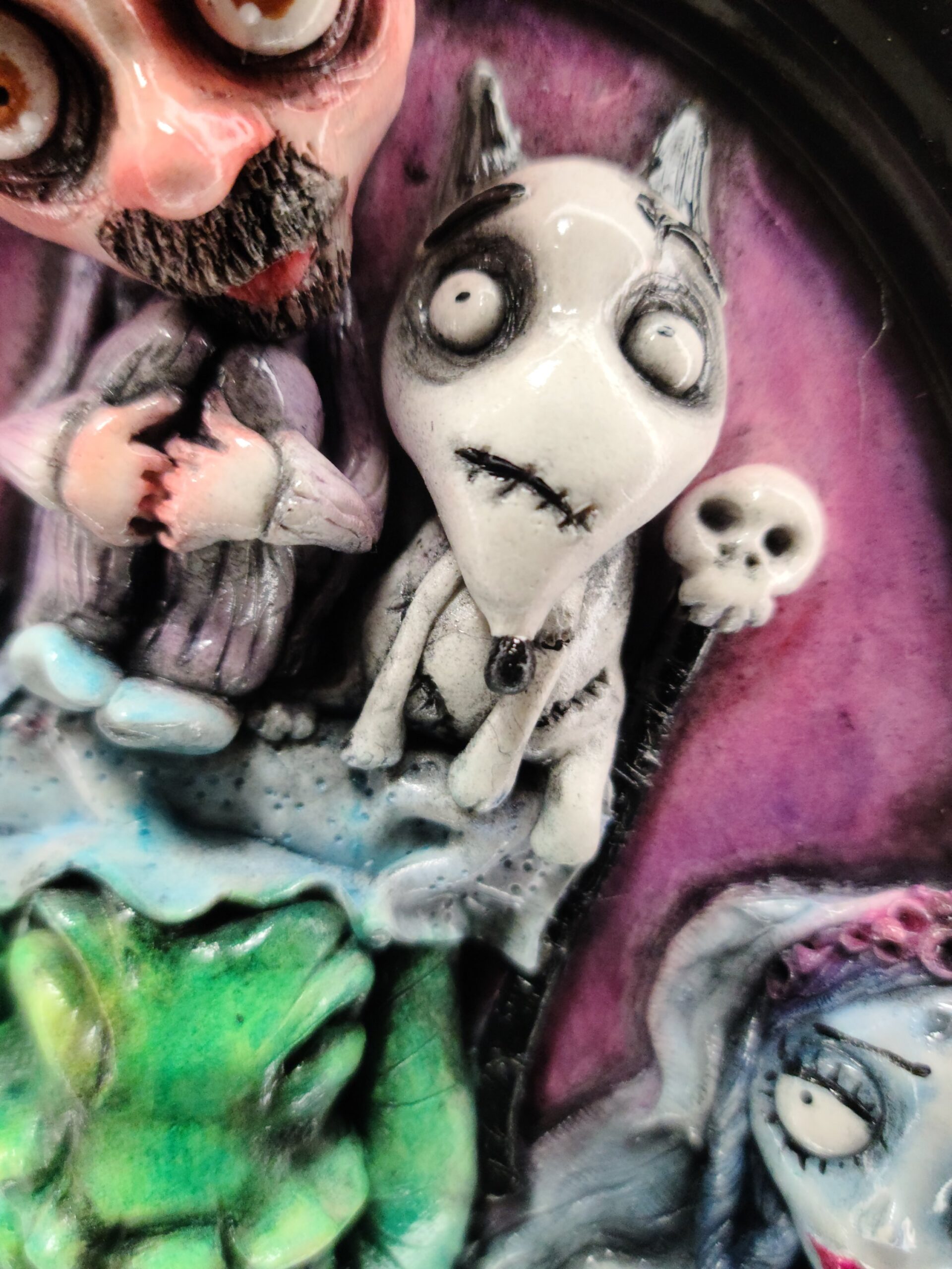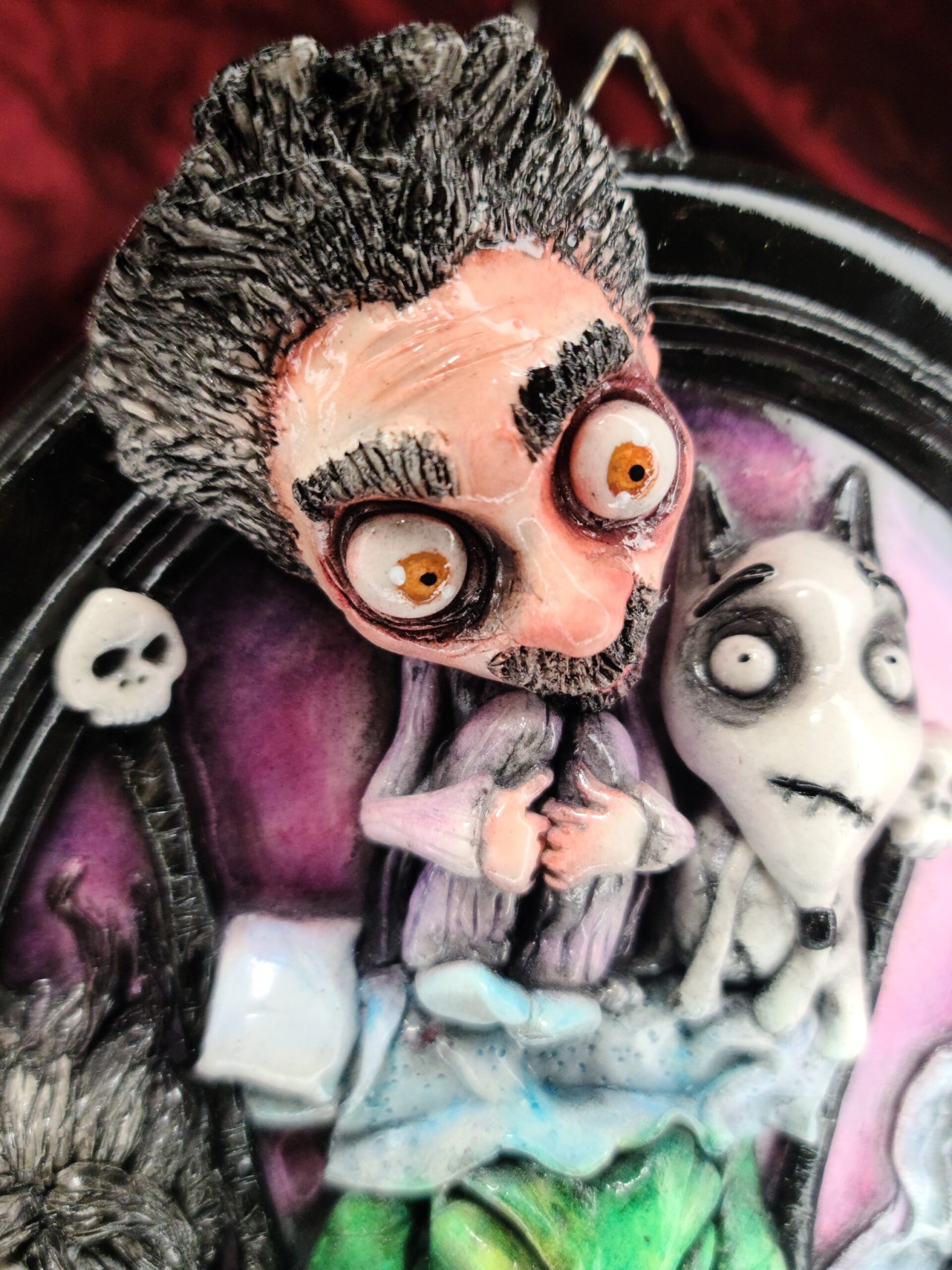 Un quadro tridimensionale artigianale dal concept unico, intitolato “Tim Burton’s Nightmares”, che immagina il celebre regista immerso nei suoi stessi incubi creativi. Raffigurato in pigiama, seduto sul letto con lo sguardo stralunato, Tim Burton diventa qui il sognatore circondato dalle creature più iconiche del suo immaginario gotico e fiabesco: Sparky da Frankenweenie, Edward Mani di Forbice, Jack Skellington, Emily la Sposa Cadavere e l’inquietante Oogie Boogie (Bao Bao nella prima versione italiana), la figura verde tratta da Nightmare Before Christmas. Una visione ironica e affettuosa che trasforma i personaggi più amati del regista nei suoi incubi più vividi… o forse nelle sue muse più fedeli.